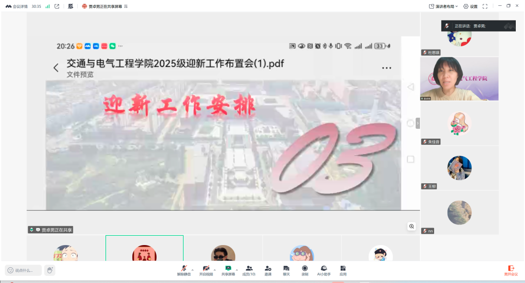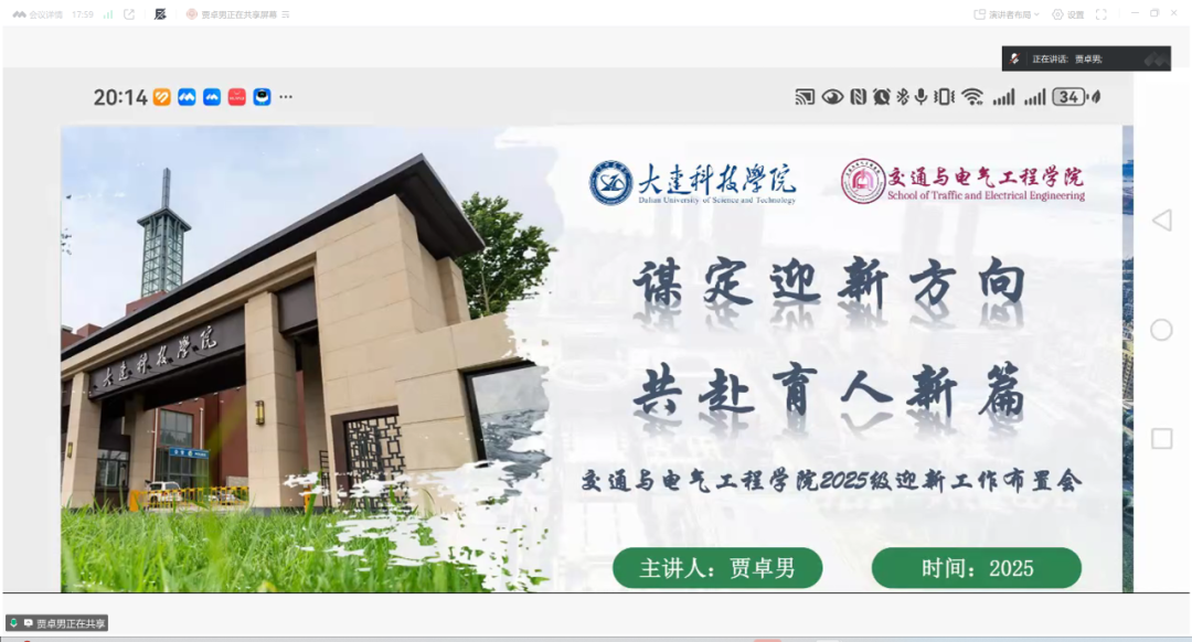 本次会议由交通与电气工程学院党总支副书记兼副院长贾卓男主讲,新生辅导员朱佳音、杨潇、李卯、王柳、李侨宁,团委学生会主席于銘嘉,团委副书记杜思琪、李禹瑶,新闻媒体中心主任张洋参会。