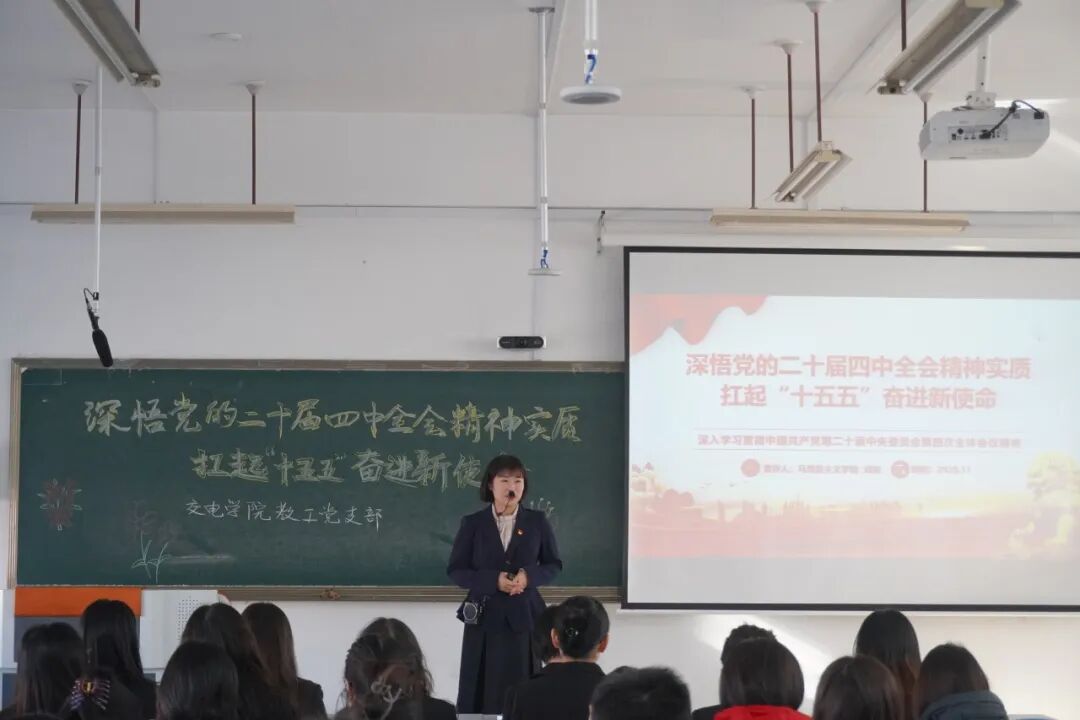 为深入学习贯彻党的二十届四中全会精神,引导广大师生深刻领会“十五五”规划战略部署,2025年11月20日,我校马克思主义学院副院长郑旭以“深悟党的二十届四中全会精神实质,扛起‘十五五’奋进新使命”为题,开展专题宣讲活动,交通与电气工程学院全体教师党员共同参与学习。