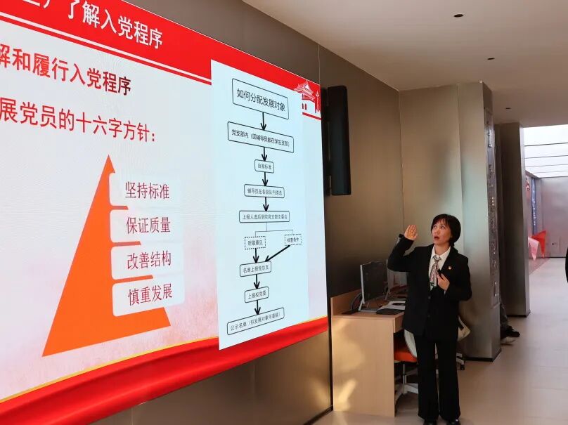 实践指引环节,贾卓男书记聚焦入党积极分子成长成才关键,系统阐释正确入党动机核心内涵,细致解读《中国共产党章程》中入党条件、党员义务与权利的具体规定,清晰梳理发展党员“十六字方针”及完整工作程序。她向全体学员提出八点殷切期望,鼓励大家在思想上坚定理想信念、筑牢信仰之基,在学习上秉持精益求精、锤炼过硬本领,在行动上主动投身志愿服务与科创实践,以实际行动践行初心使命、向党组织靠拢。