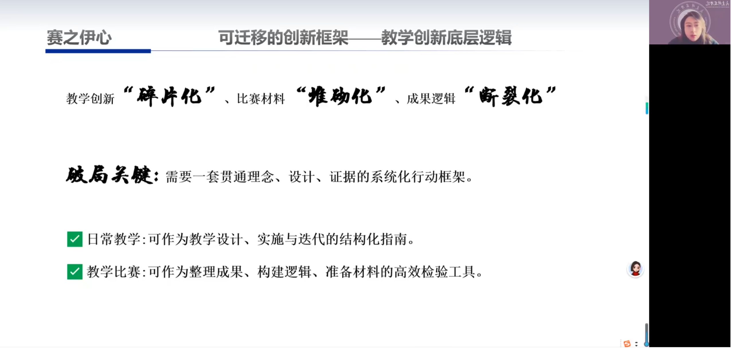 张铭真老师重点在校赛阶段的准备上进行分享。她强调课程内容应具备明确成果导向与学生成效体现,教学内容需兼顾应用性与可检验性。在教法上,她建议适当引入AI等新技术,增强课堂互动性与前沿感。张老师特别指出教学设计与PPT制作需严格对标评审标准,确保内容完整、视觉美观。在课堂设计方面,她总结强调了若干加分项:导入环节需吸引眼球、教学结构应清晰有序、案例选用须精炼典型等。针对课程思政,她建议做到“显隐结合”,避免口号化,可借助朋辈榜样、企业实例等载体,自然融入育人内涵。