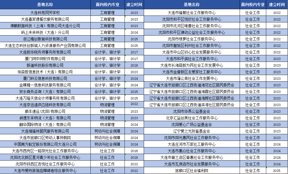 长期以来,经济管理学院十分重视实践性教学环节,注重对学生实际应用能力的培养。在校企、校政合作方面,学院师生与多家校外合作单位共享资源,共建校外实践教育基地,合作育人。学院先后与大连沃尔玛山姆会员商店有限公司、大连链家房地产经纪有限公司、大连昶德公正会计师事务所有限公司、安永全球商务服务(大连)有限公司、厦门网中网软件有限公司、新道科技股份有限公司辽宁分公司、大连京迅递供应链科技有限公司、大连顺丰速运有限公司、旅顺口区劳动人事争议仲裁院等多家单位建立了长期、良好的校企、校政合作关系。截止2024年7月,学院共获批“大连科技学院-大连市甘井子区社会福利院”辽宁省大学生校外实践教育基地、大连市青少年社会工作者培训基地、大连市旅顺口区公益慈善与社会工作实践研究基地等5个实践教育基地,为提高学院社会工作专业学生的专业实践能力提供了充足的条件。