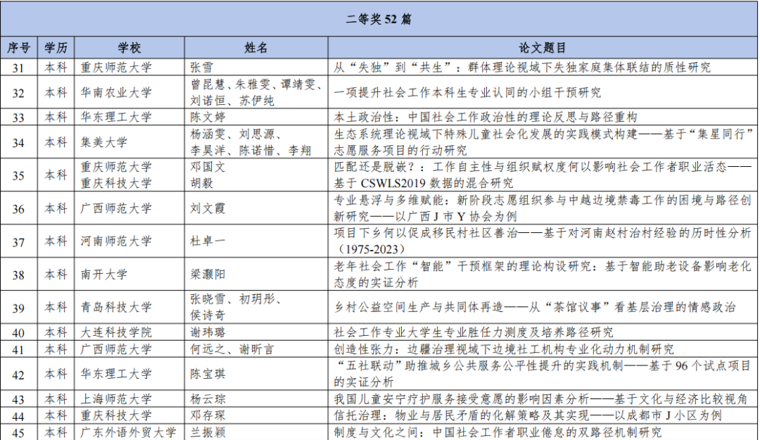 论坛后期,为表彰优秀学术成果,激励学子深入开展社会工作领域研究,专家评审团经过多轮严谨评审,最终评选出一等奖7篇、二等奖52篇(其中本科学生作品仅21篇)、三等奖149篇。