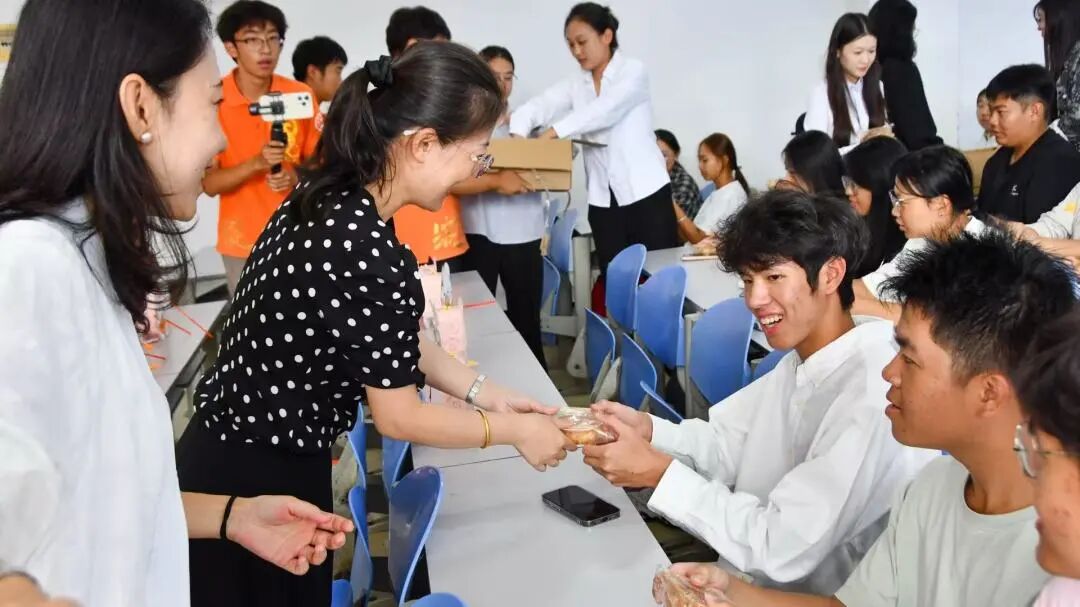 活动当日,校园檐角红灯笼摇曳,月饼甜香在楼宇间流转,双节氛围格外浓厚。教室里,辅导员将包装雅致的月饼整齐摆放,待小科们落座后,逐位递至手中,还轻声分享中秋习俗,让教室漾起团圆暖意;寝室楼内,辅导员提着月饼走访每间寝室,敲门送上祝福与月饼时,还细心问询生活与学业,叮嘱学子照料好自己。小科们接过月饼,指尖触到包装的温度,脸上的笑意愈发真切,眼里满是对这份节日心意的珍视。