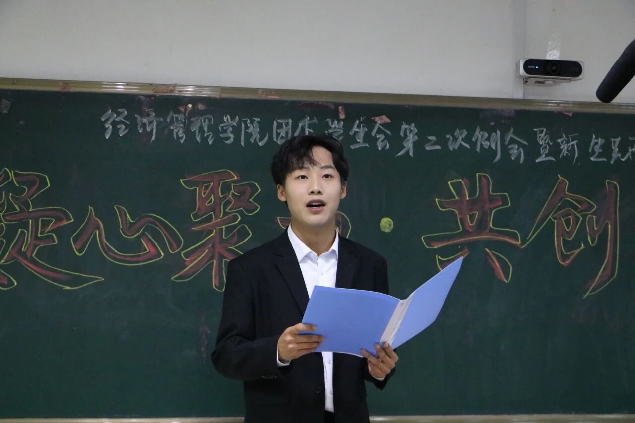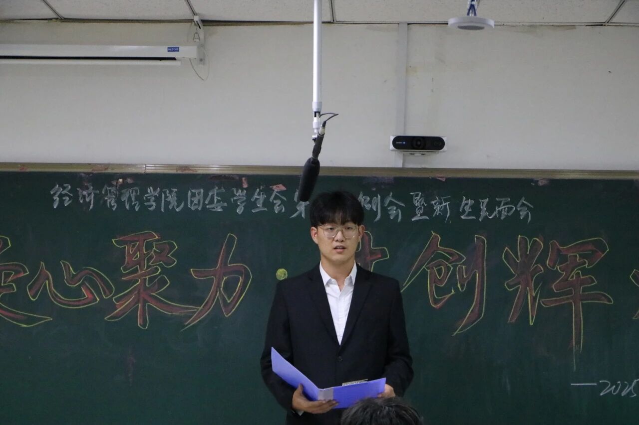 由经济管理学院学生会主席许毓轩同学发言,他表示:“希望大家尽快褪去青涩、融入集体,敢用新想法突破、在任务中担当,在服务同学与学院的小事里积累本领,实现“服务他人”与“提升自我”双向奔赴。” 同时对老成员提要求:“作为“中坚力量”要做好“传帮带”,既教新生工作流程与技巧,也传递“踏实做事、团结协作”作风,共同推动经济管理学院学生会迈上新台阶、实现新突破”。