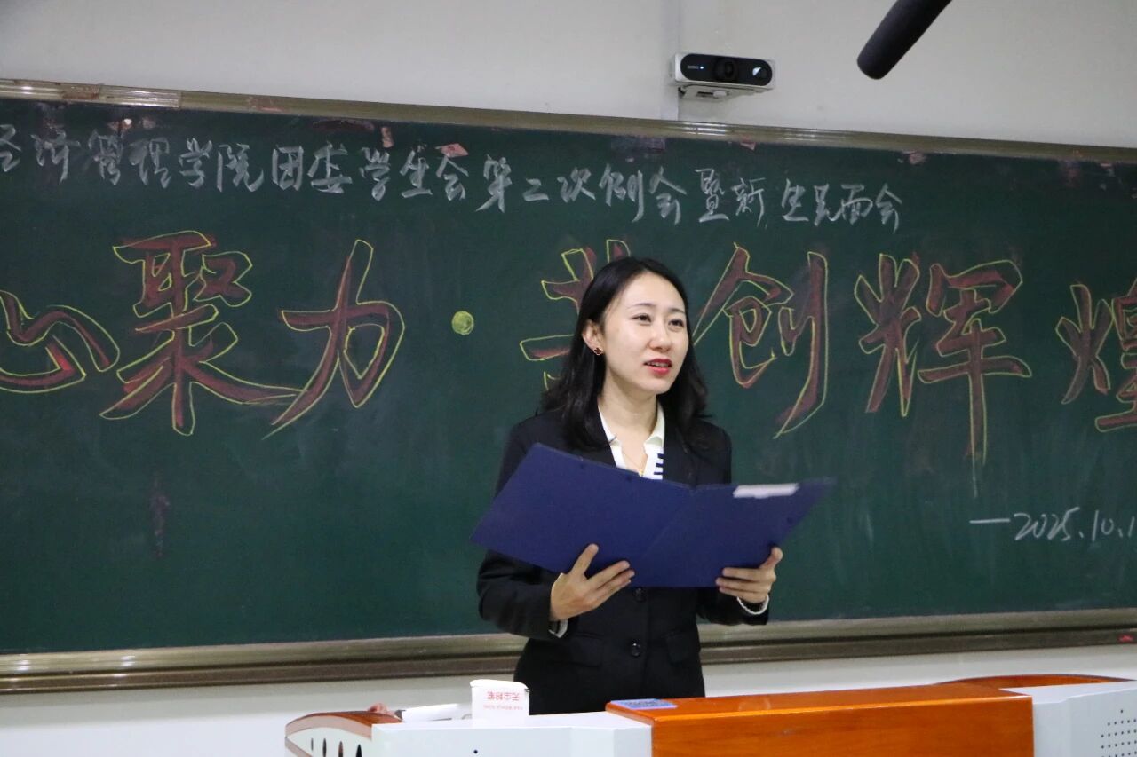 经济管理学院党总支副书记、副院长梅傲雪老师为本次例会致辞。她首先向加入团委学生会的全体新生致以热烈欢迎,随后明确了团委学生会下一阶段的核心工作任务,并就学校审核评估期间的各项具体工作提出明确要求。她强调,学生会成员在日常学习与生活中必须以身作则、严于律己;当前学校审核评估任务艰巨,希望全体成员将此次考验视为锤炼自身能力的宝贵契机,真正做到凝心聚力,以高度的责任感与扎实的执行力,充分展现团委学生会的过硬作风与良好精神风貌。