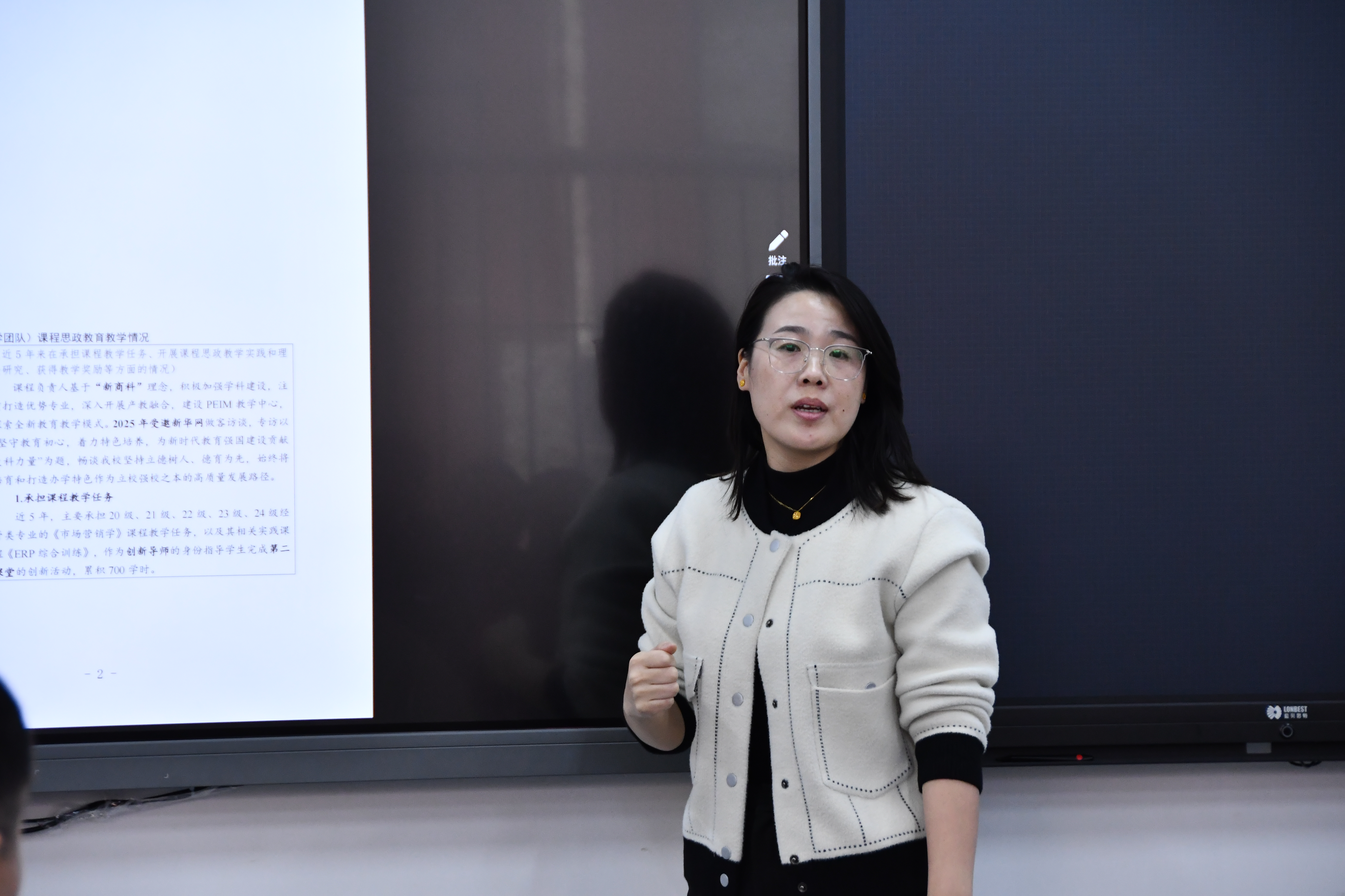 会计学专业教研室主任李婷婷老师则围绕省级课程思政示范课程《市场营销学》的申报实践,详细解析了申报书的框架结构与撰写要点,并重点分享了“四驱八融”课程思政设计理念——即以价值引领、知识传授、能力培养、素养提升为驱动,实现思政元素在教学目标、内容、方法、评价等八个维度的深度融合,为后续课程建设提供了可复制、可推广的宝贵经验。