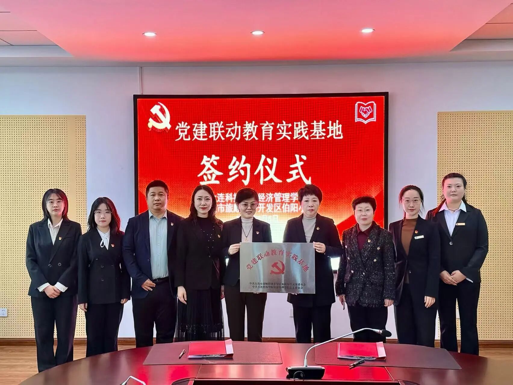 仪式现场,经济管理学院党总支书记、院长刘爽与大连市旅顺经济开发区伯阳小学书记、校长李娜共同签订党建联动教育实践基地合作共建协议并揭牌,标志着双方在思政育人、红色传承、志愿实践等方面的院校共建迈入制度化、常态化新阶段。
