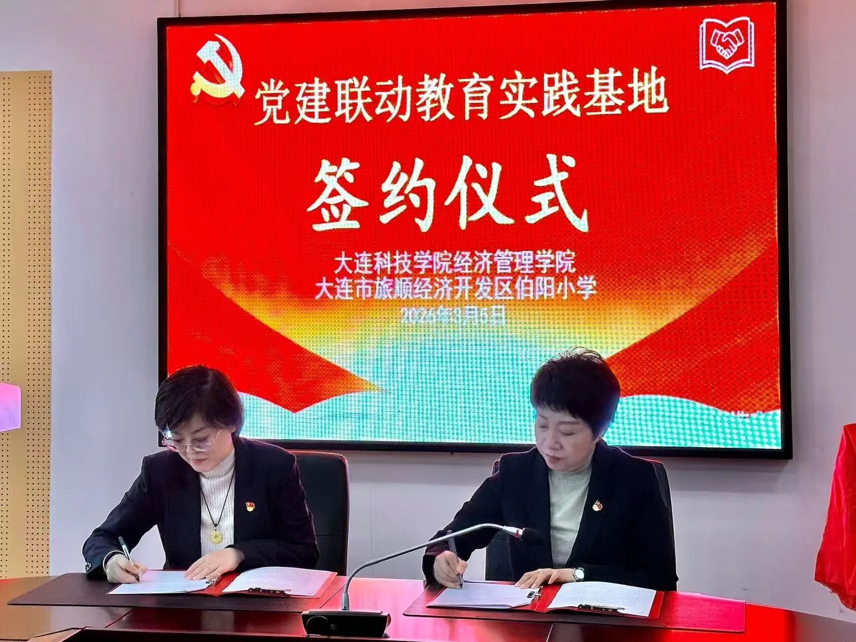 为深挖辽宁红色文化与“雷锋精神发祥地”育人底蕴,落实大中小一体化建设要求,紧扣学校2026年春季“英雄永不谢幕”开学第一课主题部署,大连科技学院经济管理学院与大连市旅顺经济开发区伯阳小学深化思政共建成果,于2026年3月5日在伯阳小学会议室举行党建联动教育实践基地签约暨揭牌仪式,仪式后开展金伯阳展馆参观活动,以院校协同育人为抓手,让英雄精神与雷锋精神在红色传承中薪火相传。