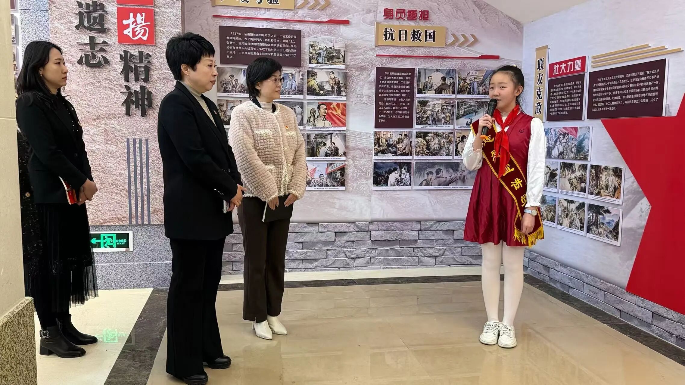 揭牌仪式后,双方领导与我院师生代表走进伯阳小学金伯阳展馆开展参观活动。在小讲解员们的引导下,大家借助历史图片、文字史料和英雄事迹介绍,全方位了解金伯阳为国家和民族不懈奋斗的革命历程,深刻感悟其爱国情怀、革命气节与崇高品格。现场师生认真聆听、驻足凝视,在沉浸式红色氛围中接受党性教育与精神洗礼,坚定了理想信念,强化了责任担当意识,对辽宁红色文化及英雄精神的时代价值有了更深理解认同。