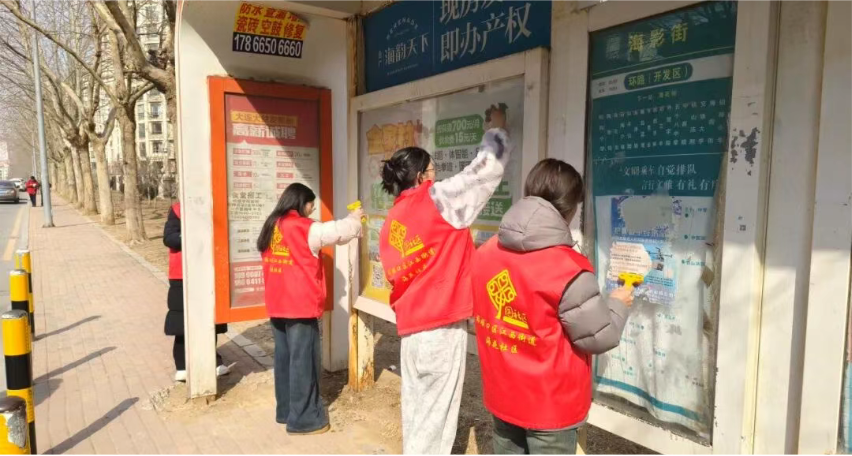 反诈宣传告一段落后,志愿者们迅速转换角色,化身“环境美化师”,来到社区公交车站开展环境整治行动。大家手持小铲子、喷水壶、棉布、钢丝球等工具,仔细清理公交站台上的顽固小广告,同时清扫周边路面垃圾。经过一番认真劳作,社区公交站点环境焕然一新,整洁有序。