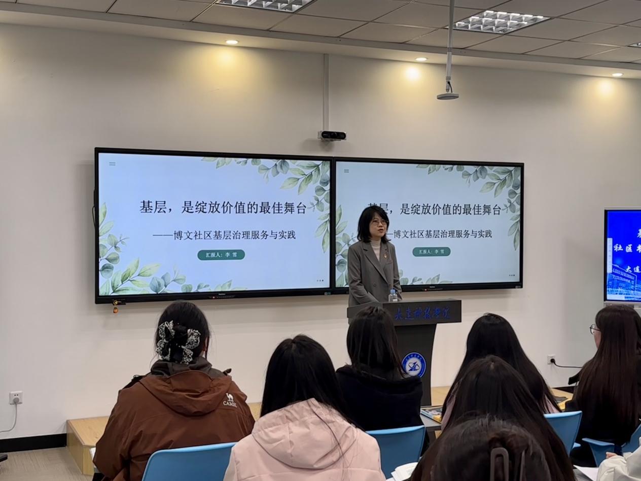 2026年4月9日,活动首期课程顺利开讲。博文社区书记李雪以“基层,是绽放价值的最佳舞台”为主题,结合社区治理实践,从社区概况、“自治・德治・法治” 三治融合、三大阵地建设、汇聚四方力量四个维度展开分享,重点讲解心理服务进社区的落地实践,用真实案例展现基层治理中心理关怀的重要作用,让在场学生直观感受基层工作的温度与价值。