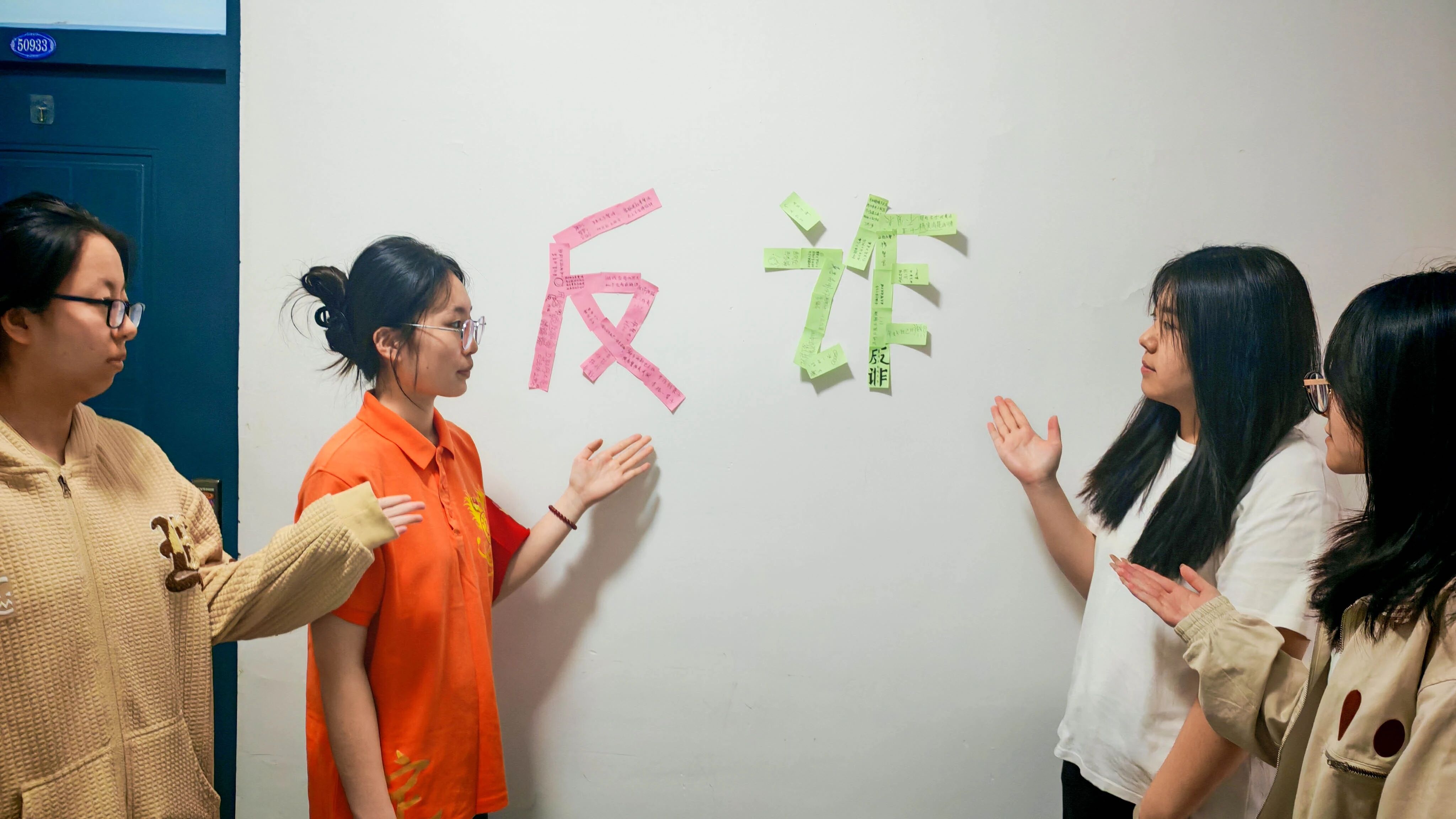 创意便利贴拼字环节更具温度与意义,每位同学将反诈警示心声落笔于便利贴,共同在走廊墙面拼就“反诈”大字,一笔一画皆是警醒,一言一行皆是担当,让反诈理念以更具感染力的方式传递蔓延。