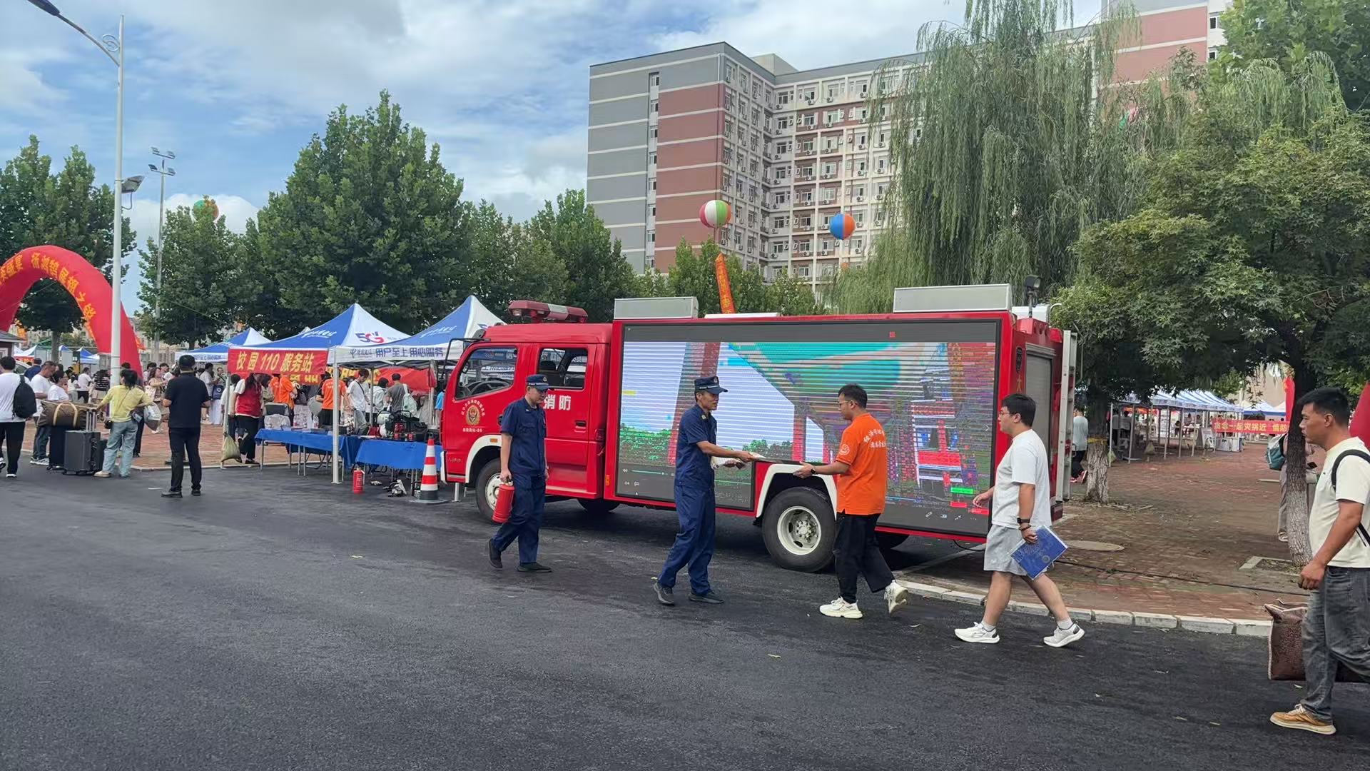 4.消防宣传“安全先行”。邀请旅顺口区羊头洼消防救援站,采用消防车LED大屏播放形式,开展防火宣传。发放宣传单,展示消防设备,提高新生消防意识。