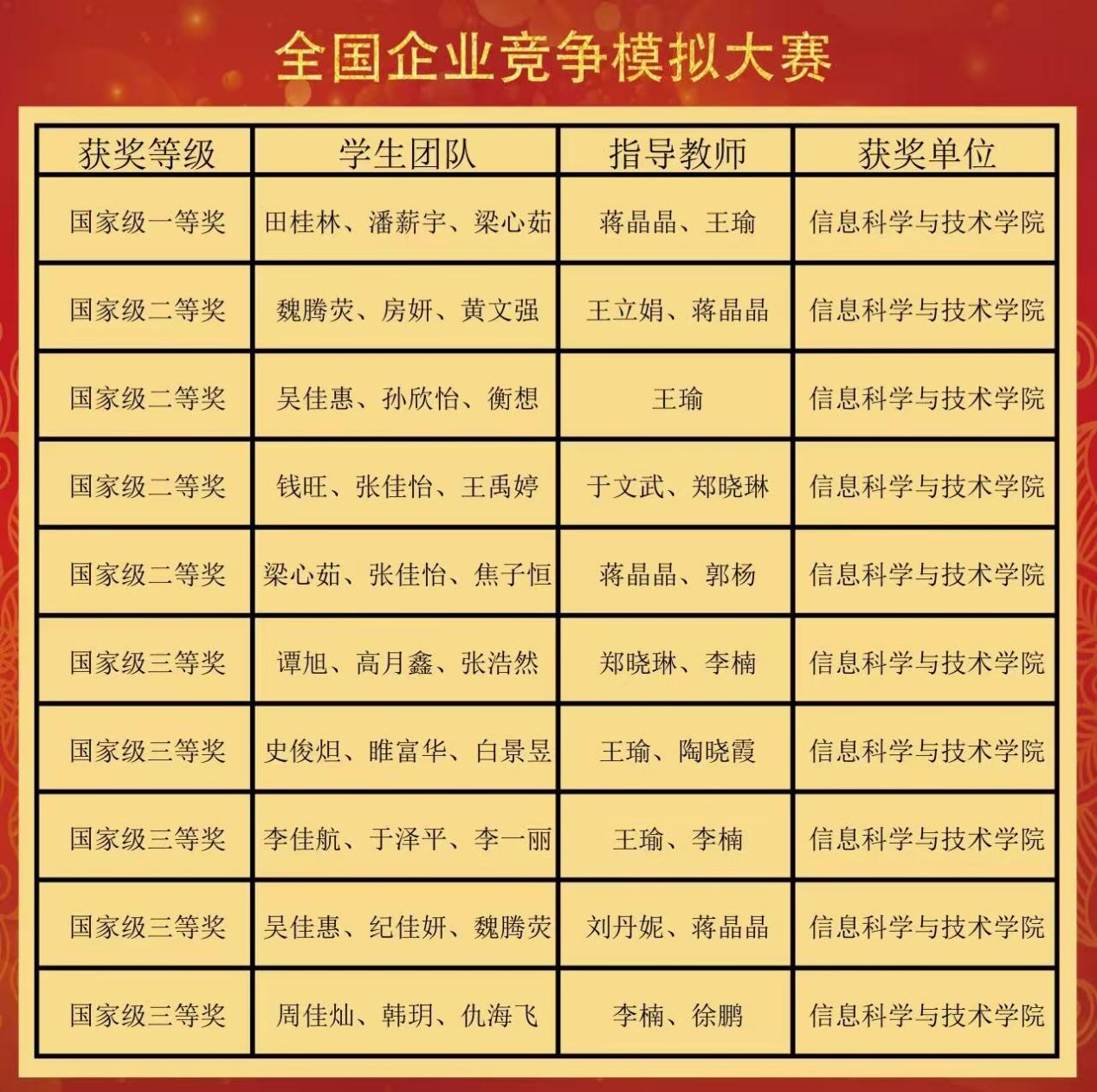 在信息科学与技术学院蒋晶晶、王瑜及多位老师的悉心指导下,我校共有10支队伍晋级半决赛,1支队伍进入全国总决赛,充分展现了我校学子在企业竞争模拟领域的卓越才能和顽强拼搏的精神风貌。