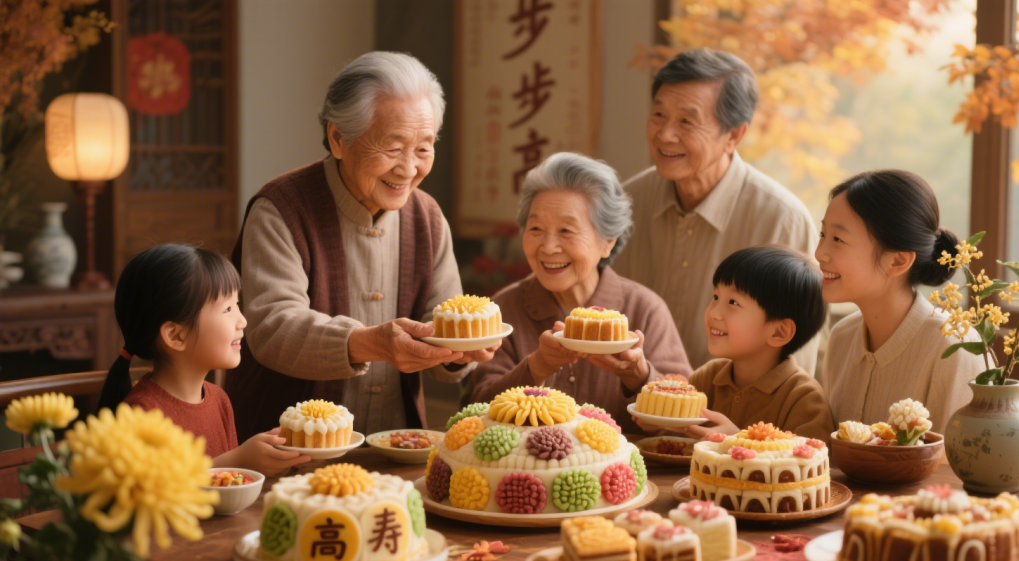 吃重阳糕有着美好的寓意,“糕”与“高”谐音,象征着“步步高升”“高寿”。在重阳节当天,人们会制作或购买重阳糕,与家人一同分享。长辈们会将重阳糕分给晚辈,祝愿他们在今后的生活中学业进步、事业有成;晚辈们也会向长辈献上重阳糕,表达对长辈的祝福与关爱。