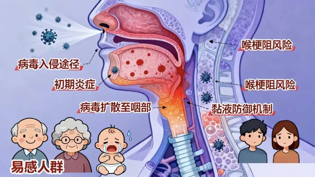 症状以发热、咳嗽、咽痛、鼻塞、流涕为核心表现,部分患者伴随乏力、头痛、肌肉酸痛、咳痰等症状,严重者可能出现胸闷、气喘、呼吸困难等表现。该病四季均可发病,以秋冬、冬春季节交替时为高发期,传染力较强,自发病前1-2天至症状缓解期均可能具有传染性,主要通过飞沫传播,也可经接触被病原体污染的物品间接传播,人群普遍易感,在校园集体生活环境中易出现聚集性感染。