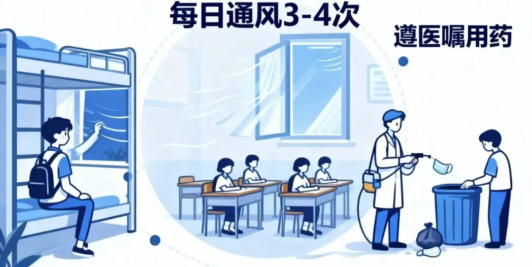 2. 防护消杀:遵医嘱用药,患者所在宿舍、教室每日通风3-4次,做好环境消杀与垃圾处理。
