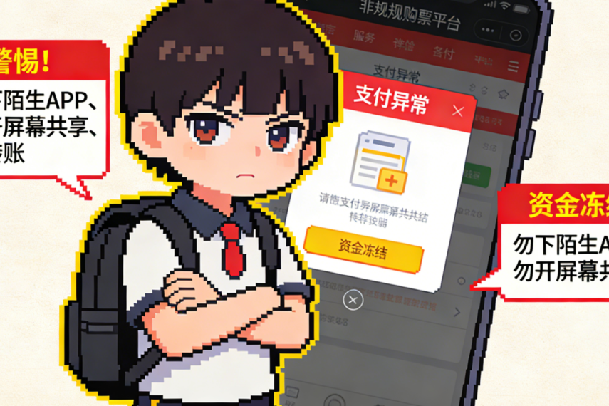 面对这类诈骗,同学们需明确:务必通过官方渠道购票,不轻信非正规平台低价信息;坚决拒绝陌生APP,不共享设备屏幕,不私下转账,从源头规避风险。