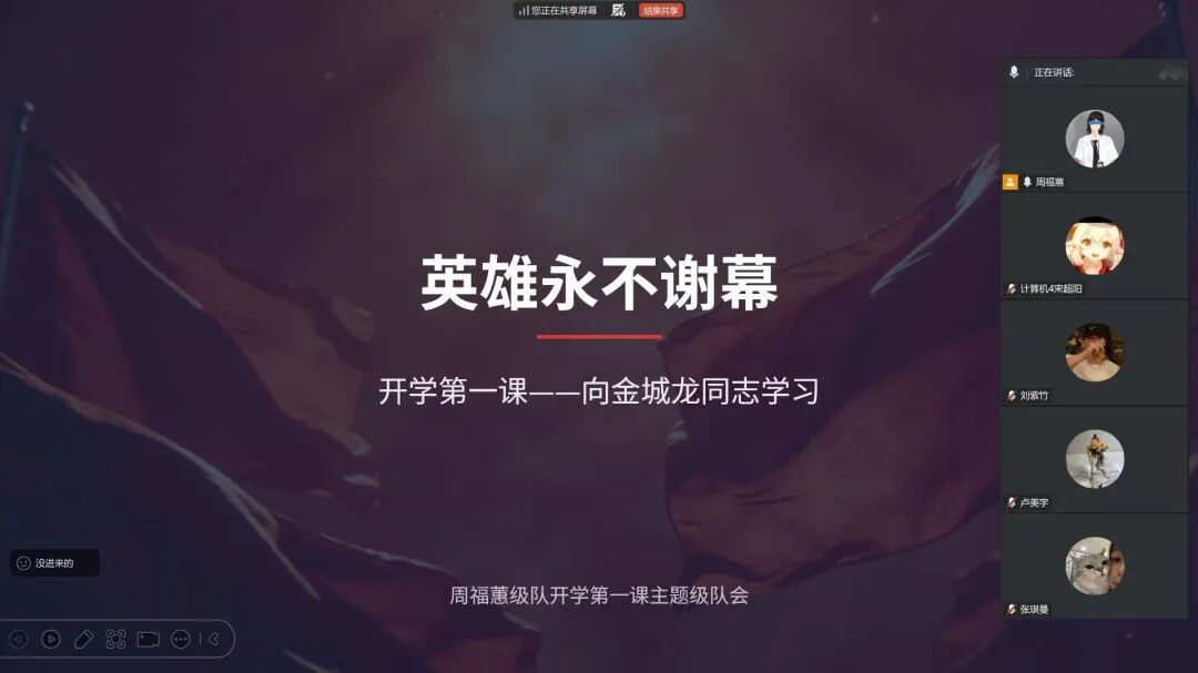 在级队会集中学习的基础上,各班级纷纷召开“英雄永不谢幕”主题班会,围绕金城龙同志“信念坚定、矢志报国”的思想品格、“舍生忘死、挺身而出”的英雄气概、“甘于奉献、服务社会”的高尚情操、“永葆本色、向上向善”的朴实作风,开展深入讨论交流。