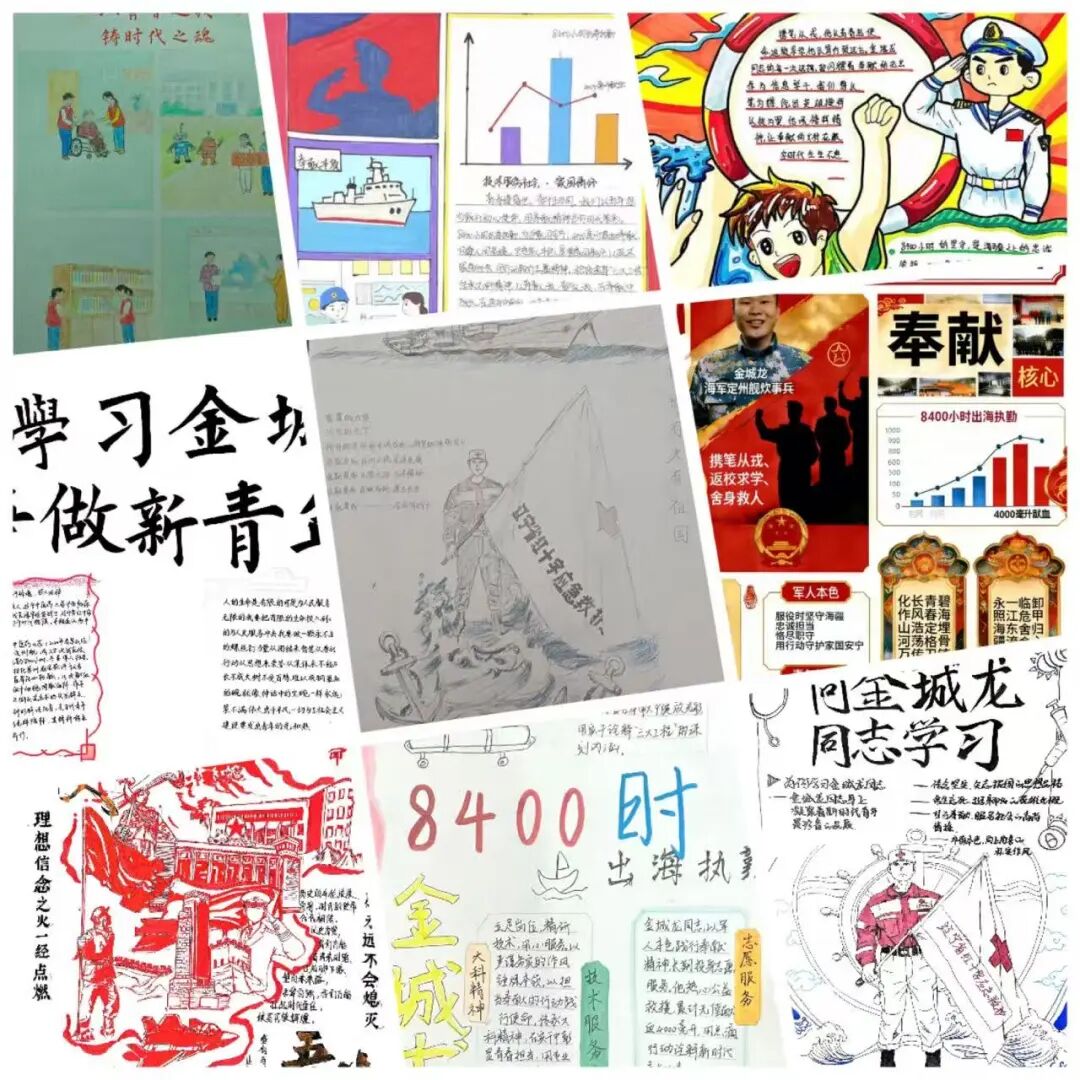 有的手抄报以“金城龙日记”为主线,摘录英雄语录、展现心路历程;有的手抄报聚焦金城龙同志参军报国、热心公益、见义勇为的人生轨迹,用时间轴串联起英雄的成长足迹;还有的手抄报以“英雄永不谢幕”为主题,通过描绘英雄形象、抒发学习感悟,表达对英雄的崇敬之情和传承之志。