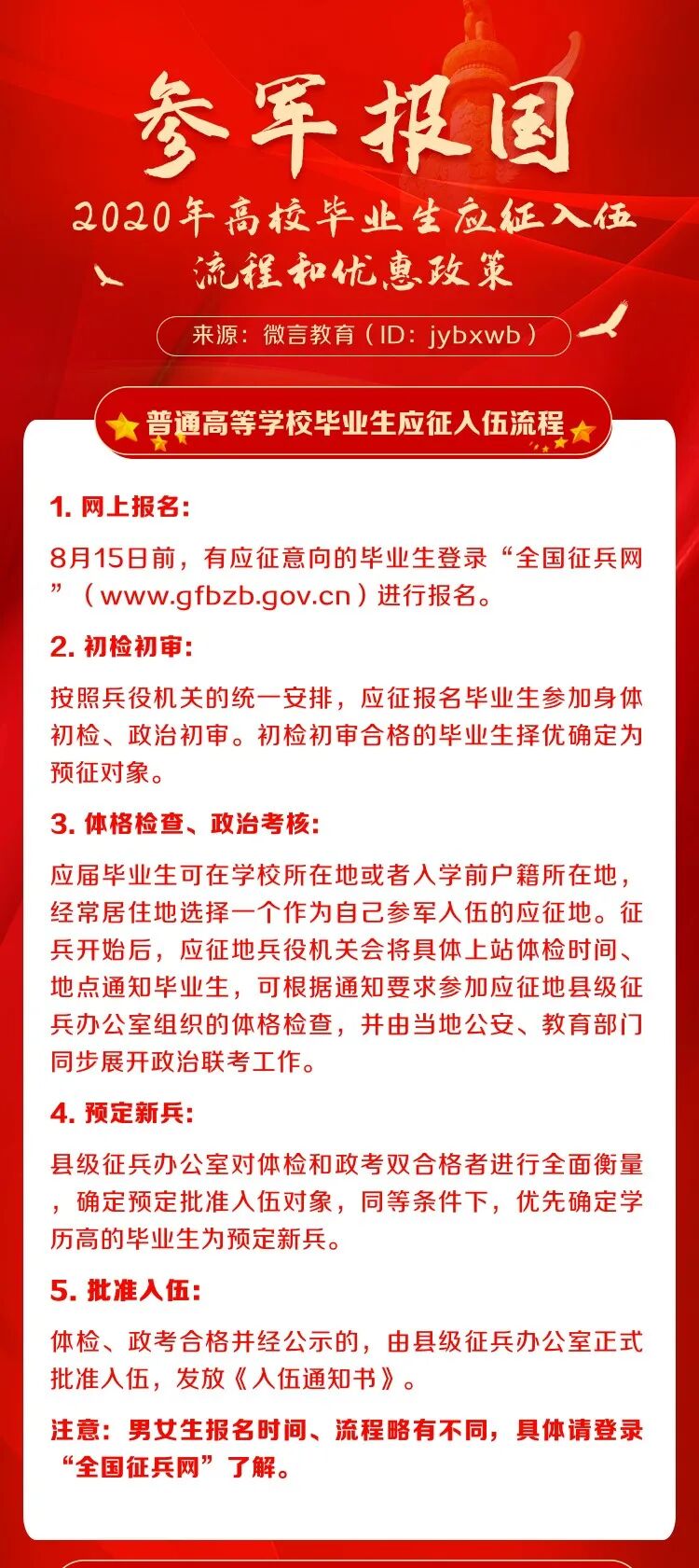 2020年高校毕业生应征入伍流程和优惠政策,8月15日前网上报名