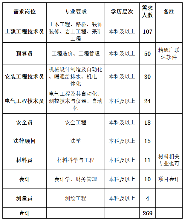1、毕业年限:上述专业原则上招录应届毕业生,对表现突出、综合素质高的优秀毕业生可放宽至具有改派资格的高校毕业生。4、“211”、“985”院校毕业生从优录取,并给予相应待遇。5、身体健康、品行端正、有良好的团队合作精神及沟通能力,能够吃苦耐劳,适应施工企业流动性的特点,同时满足经常性外地施工的条件要求。