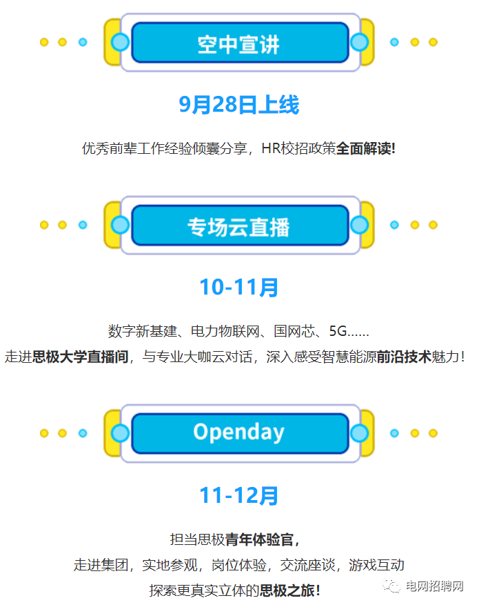 答:今年校园招聘宣讲主要以线上云宣讲(9月28日上线)、专场云直播(10-11月), 还会组织openday邀请有意向的小伙伴走进企业,担当“思极青年体验官”,线下面对面交流。集团部分分子公司会组织小型线下校园见面会,感兴趣的小伙伴请联系我们分子公司的HR小哥哥、小姐姐哦。Tip:关注【国网信通产业集校园招聘】公众号,获取最全最新校招资讯。