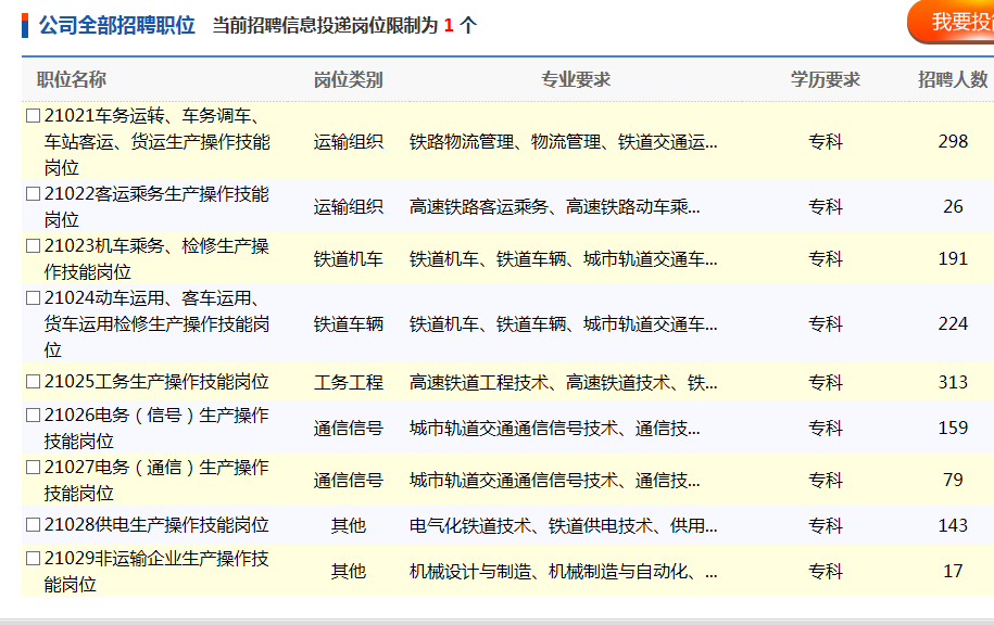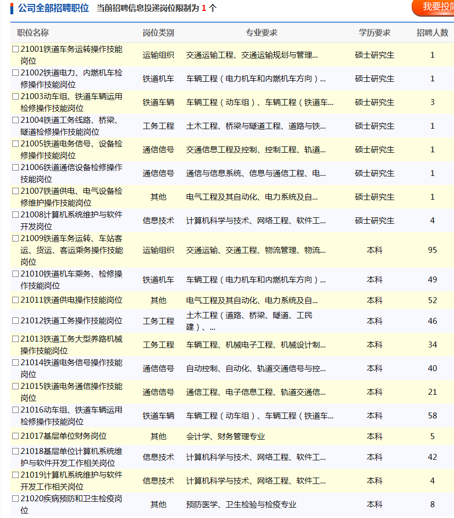 (1)岗位代码21001-21016:要求在校期间所学专业方向为铁路专业方向或所学主要课程中包含铁路专业课程,相近专业为高质量院校毕业生点击获取职位表;