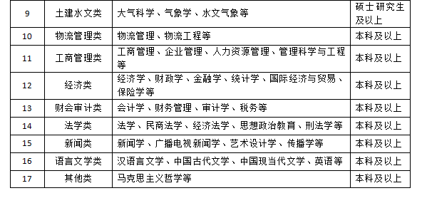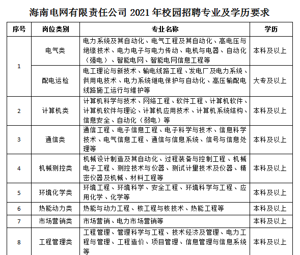 招聘专业:电气类、计算机类、通信类、机械测控类、环境化学类、热能动力类、市场营销类、工程管理类、土建水文类、勘测类、物流管理类、工商管理类、公共管理类、经济类、财会审计类、法学类、新闻类、语言文学等专业。