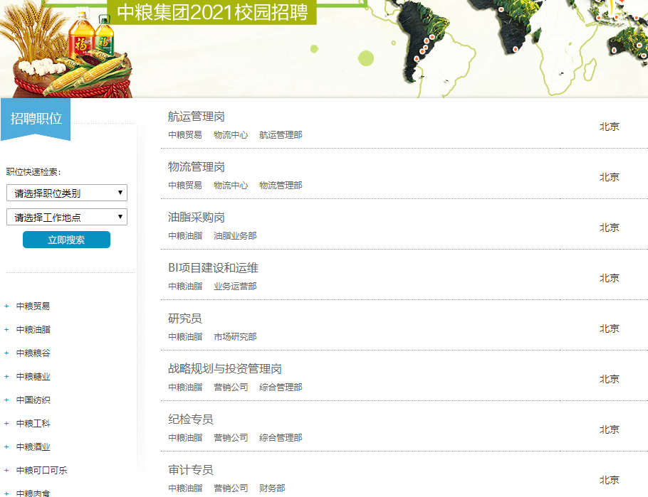 注:中粮非常重视培训工作及人才的培养。始终认为,培训是一种工作方法,是推动流程优化、组织变革和人才发展的重要工具。公司针对应届毕业生主要安排新员工入职培训、团队建设、工作流程、专业技能等培训,转正后将视情参加岗位需要的相关技能培训。