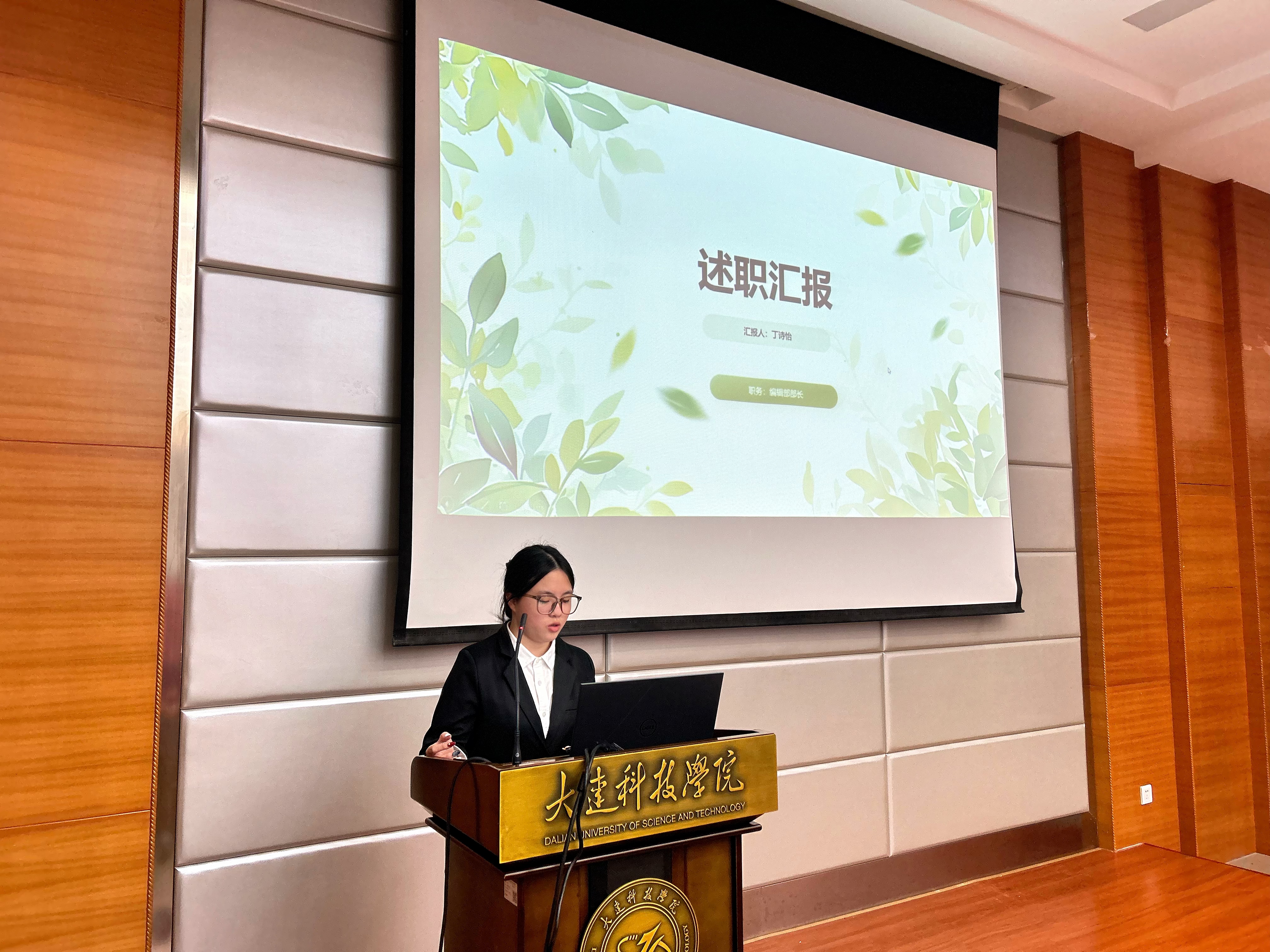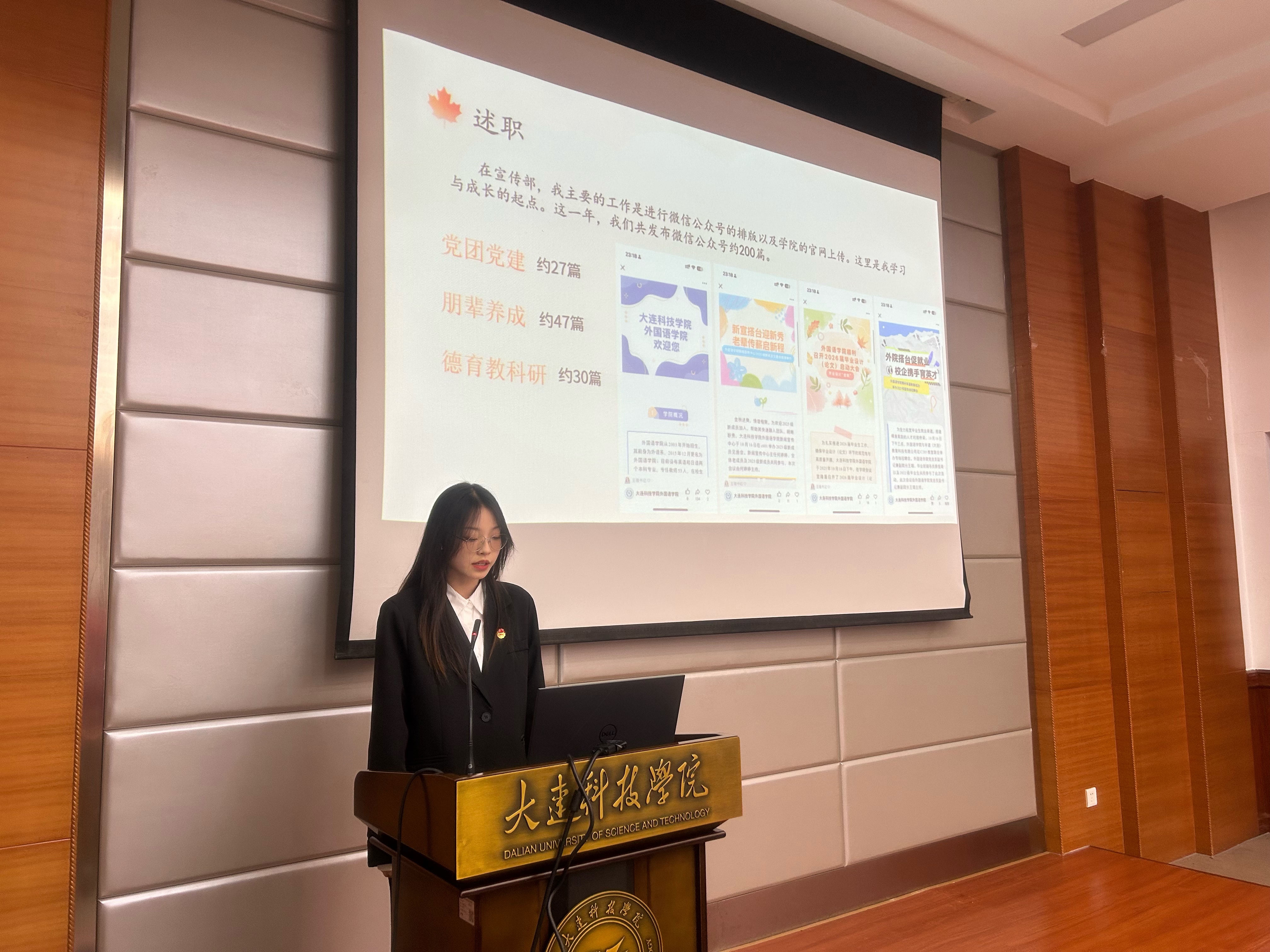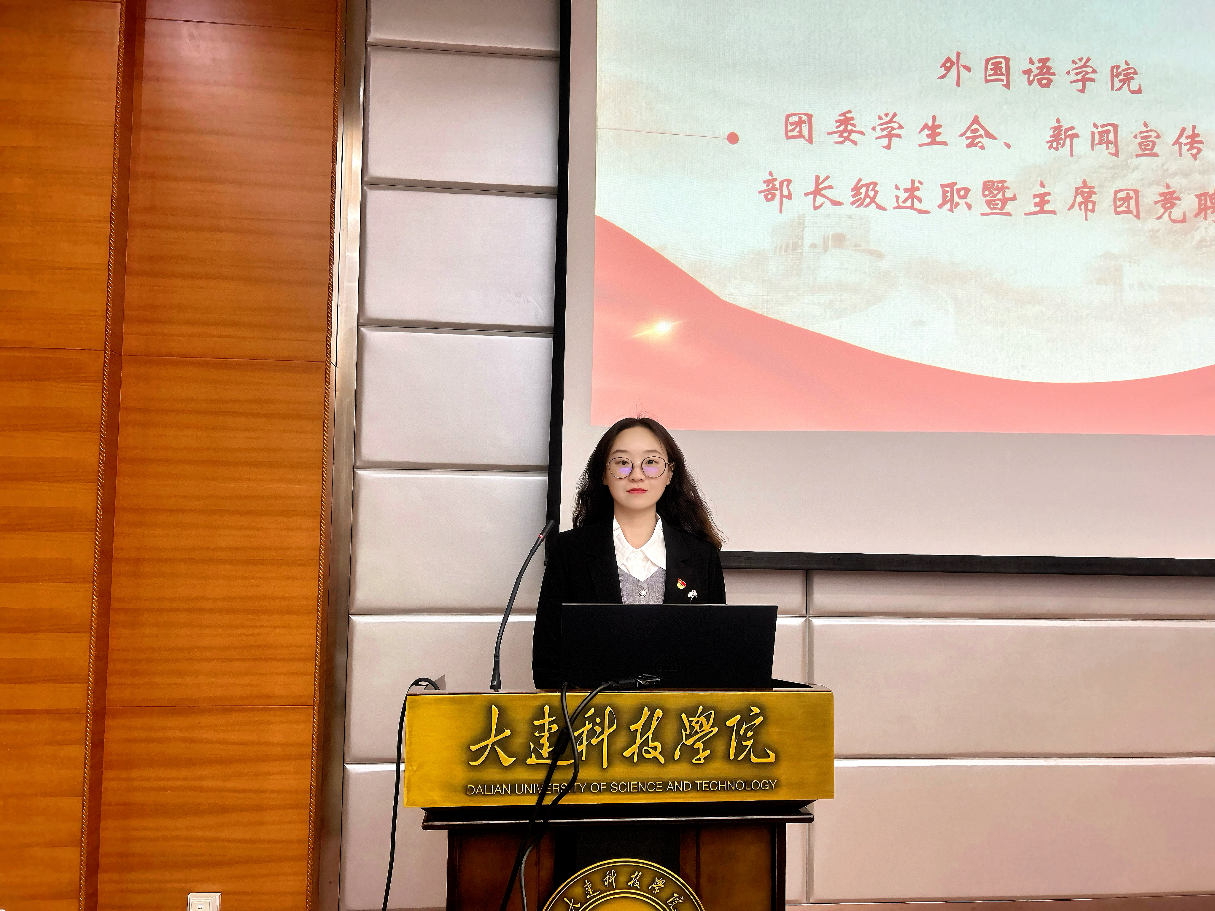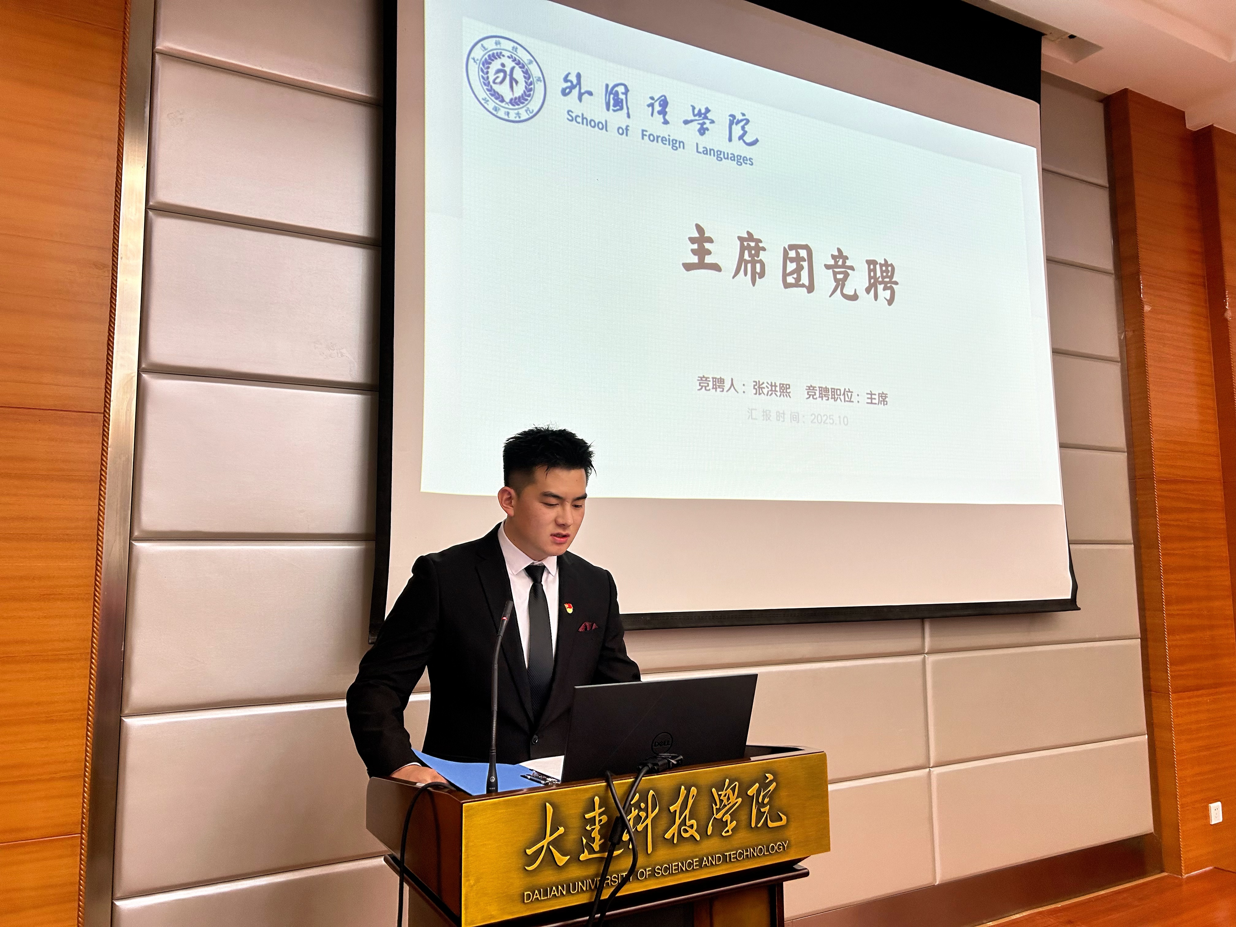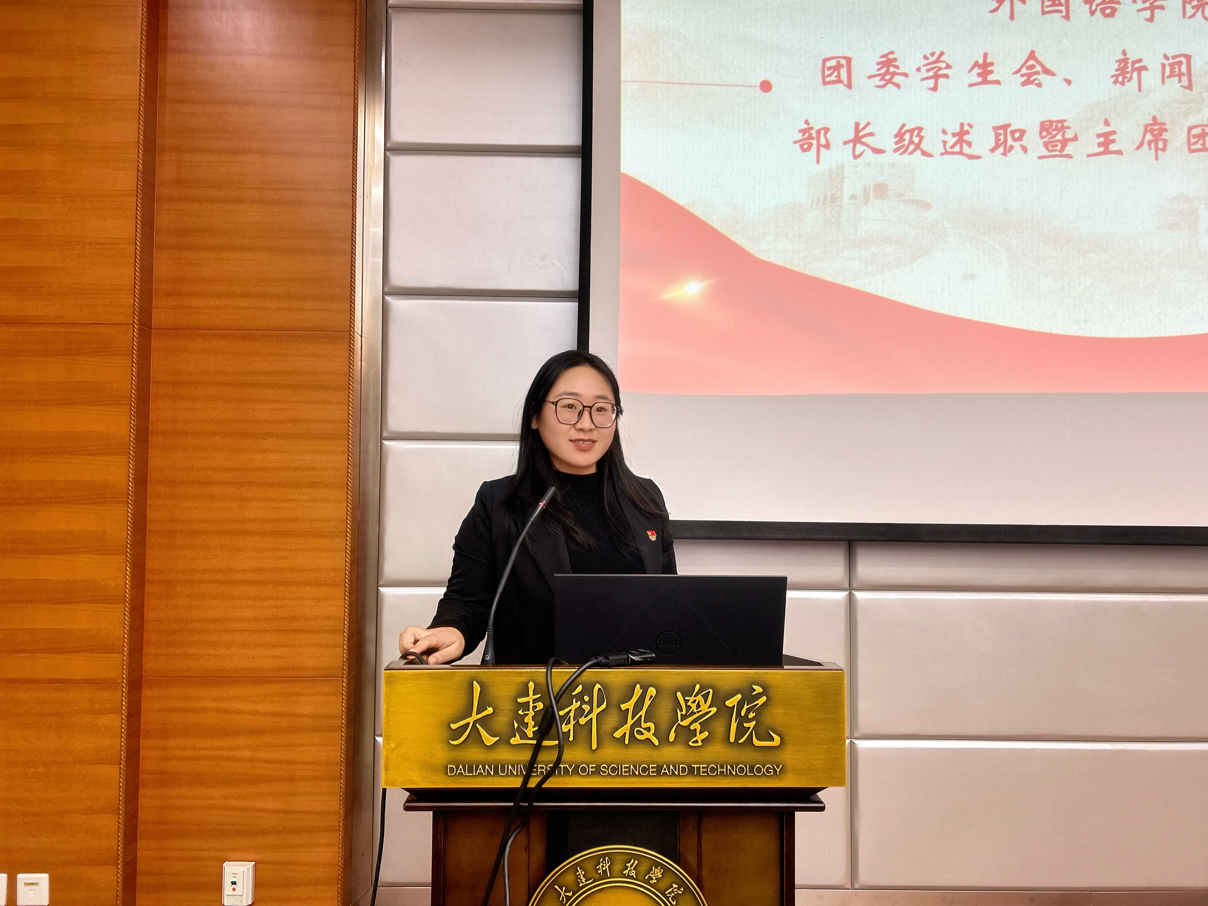 为进一步夯实学生工作团队建设基础,强化学生组织服务职能,树立全员服务意识,大连科技学院外国语学院于2025年10月20日18时,在职教105教室隆重举行第十一届团委学生会部长级述职暨主席团竞聘大会。外国语学院党总支副书记兼副院长王璐老师、学院团委书记崔雪梅老师、辅导员史佳炜老师与原佳琦老师出席会议,学生会主席团及各部门骨干竞选人员共同参会。本次会议由外国语学院24级日语专业1班的付柯萌主持。
