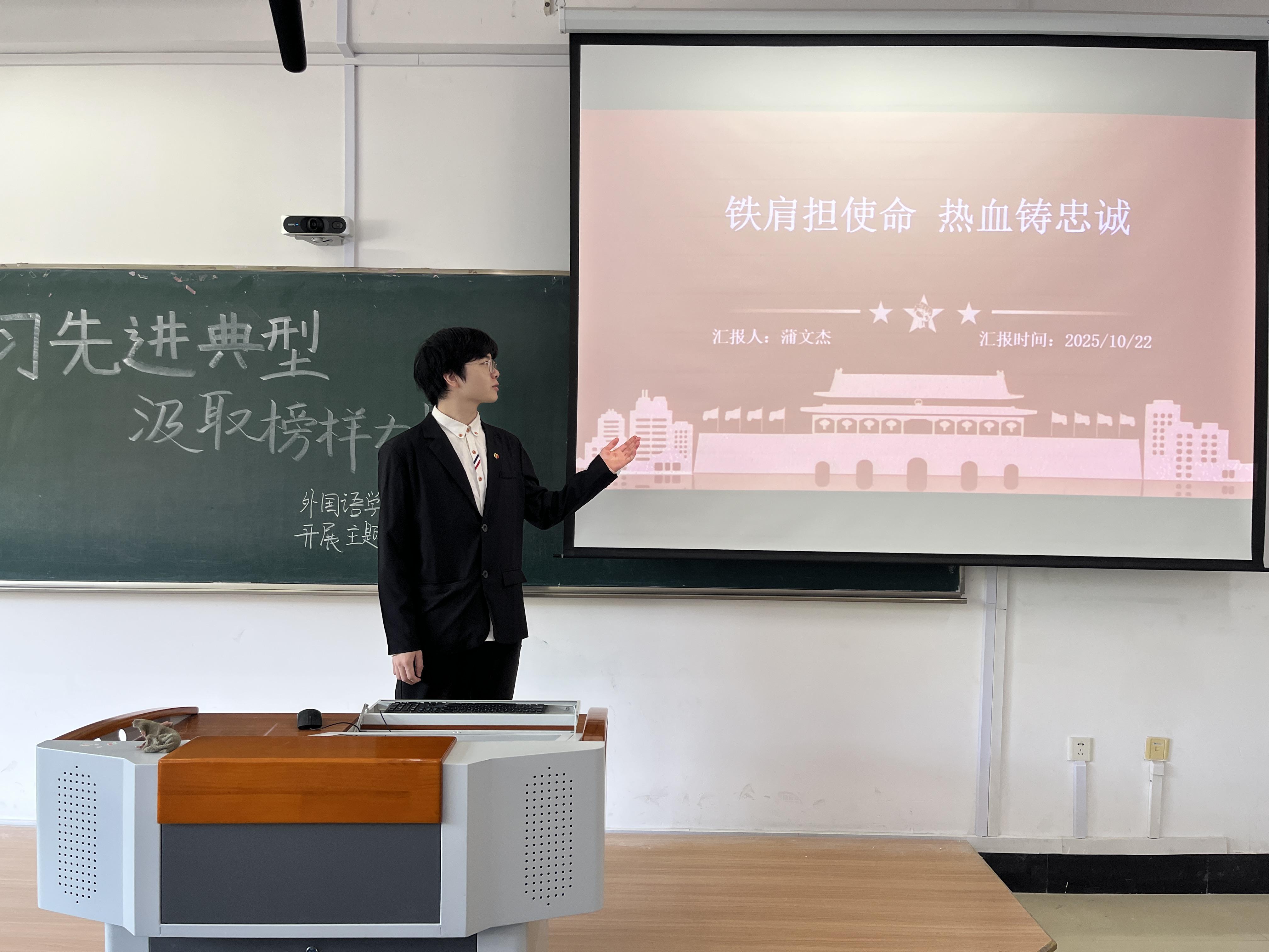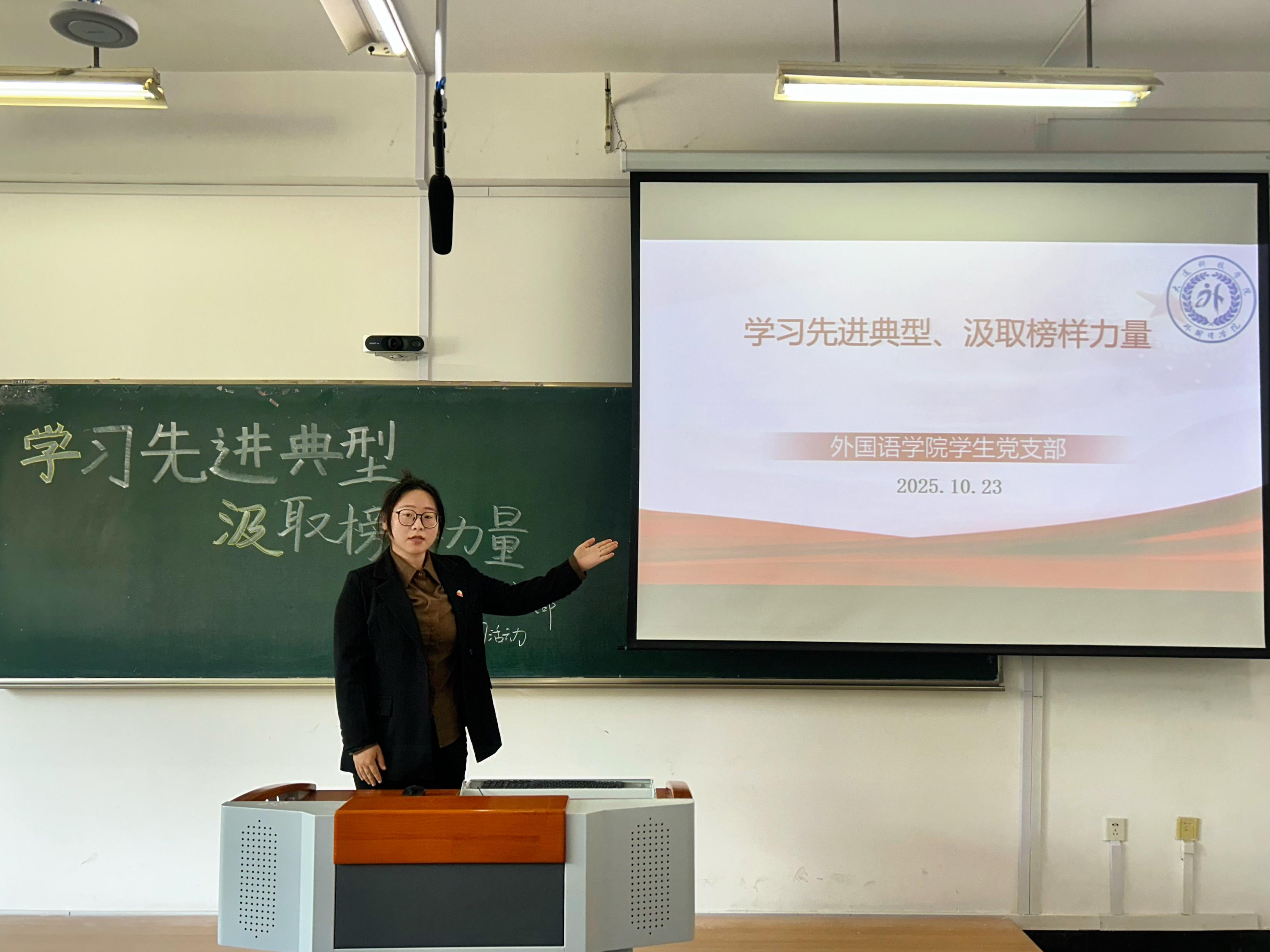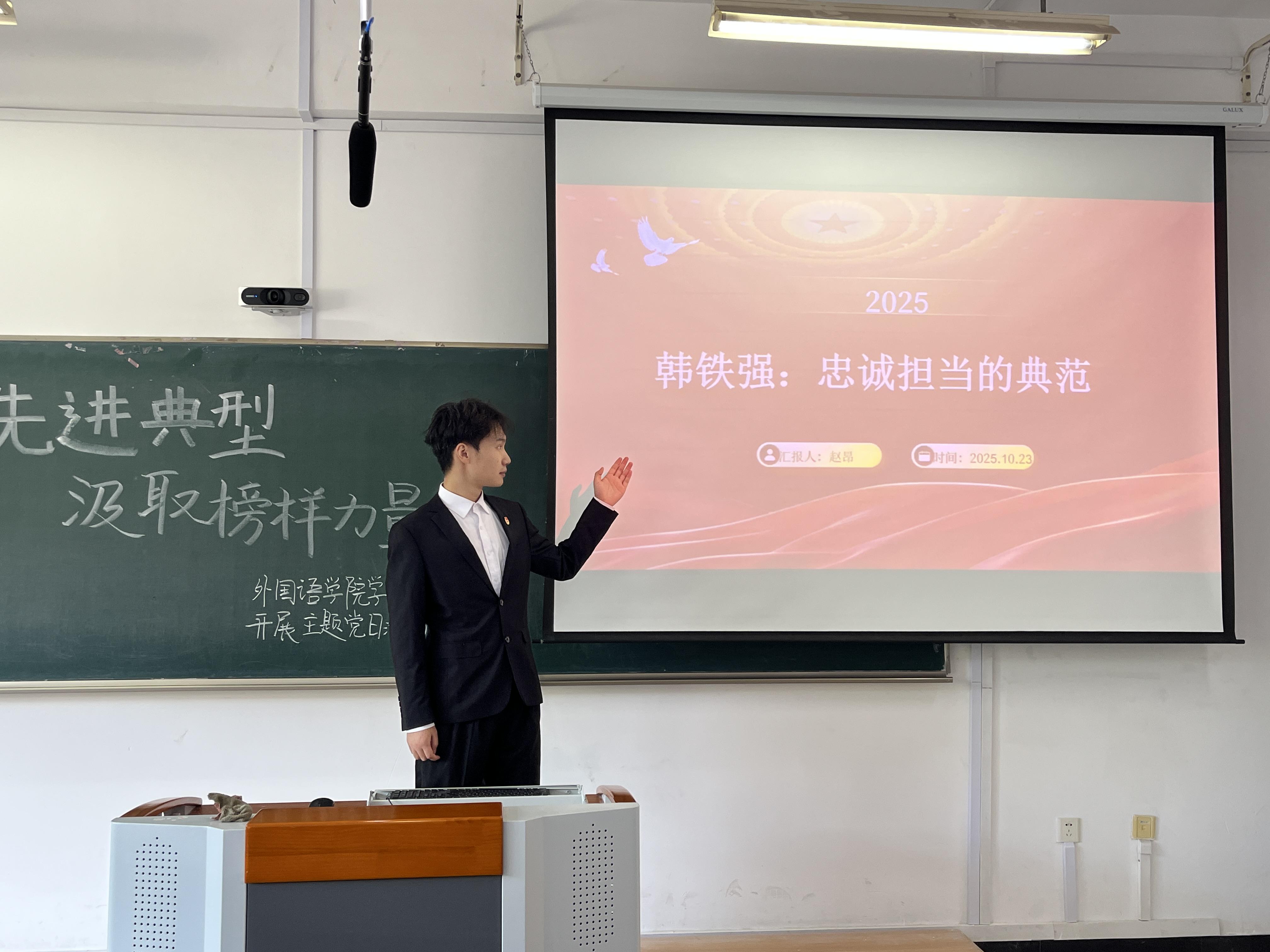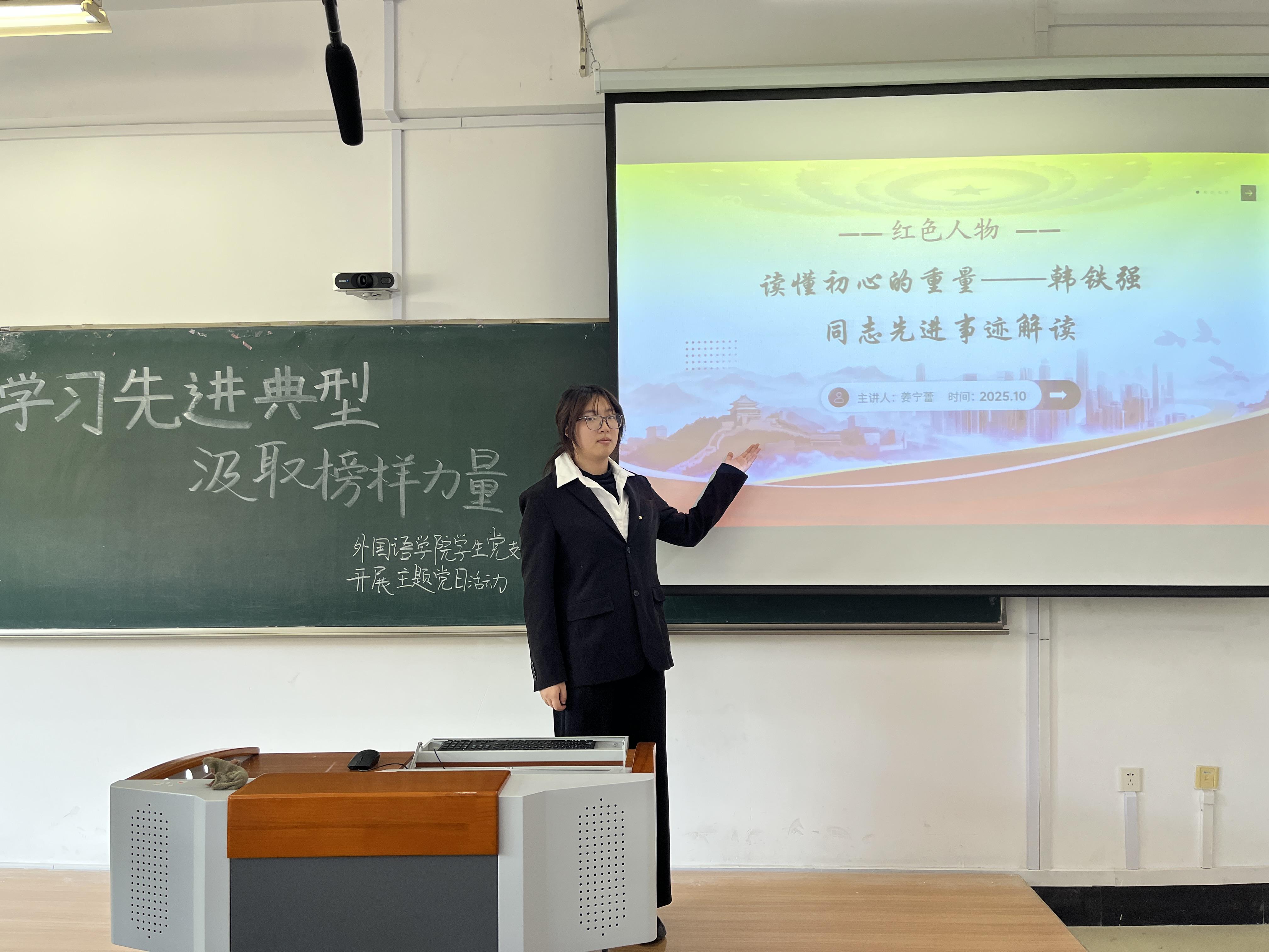 为深入学习先进典型精神,凝聚党员奋进力量,10 月 23 日,外国语学院学生党支部在 C210 教室开展 “学习先进典型、汲取榜样力量” 主题党日活动,专题学习 “辽宁省优秀党务工作者” 韩铁强的先进事迹。外国语学院团委书记崔雪梅、学生党支部书记原佳琦、学生党支部组织员史佳炜老师参会,支部全体党员参加。