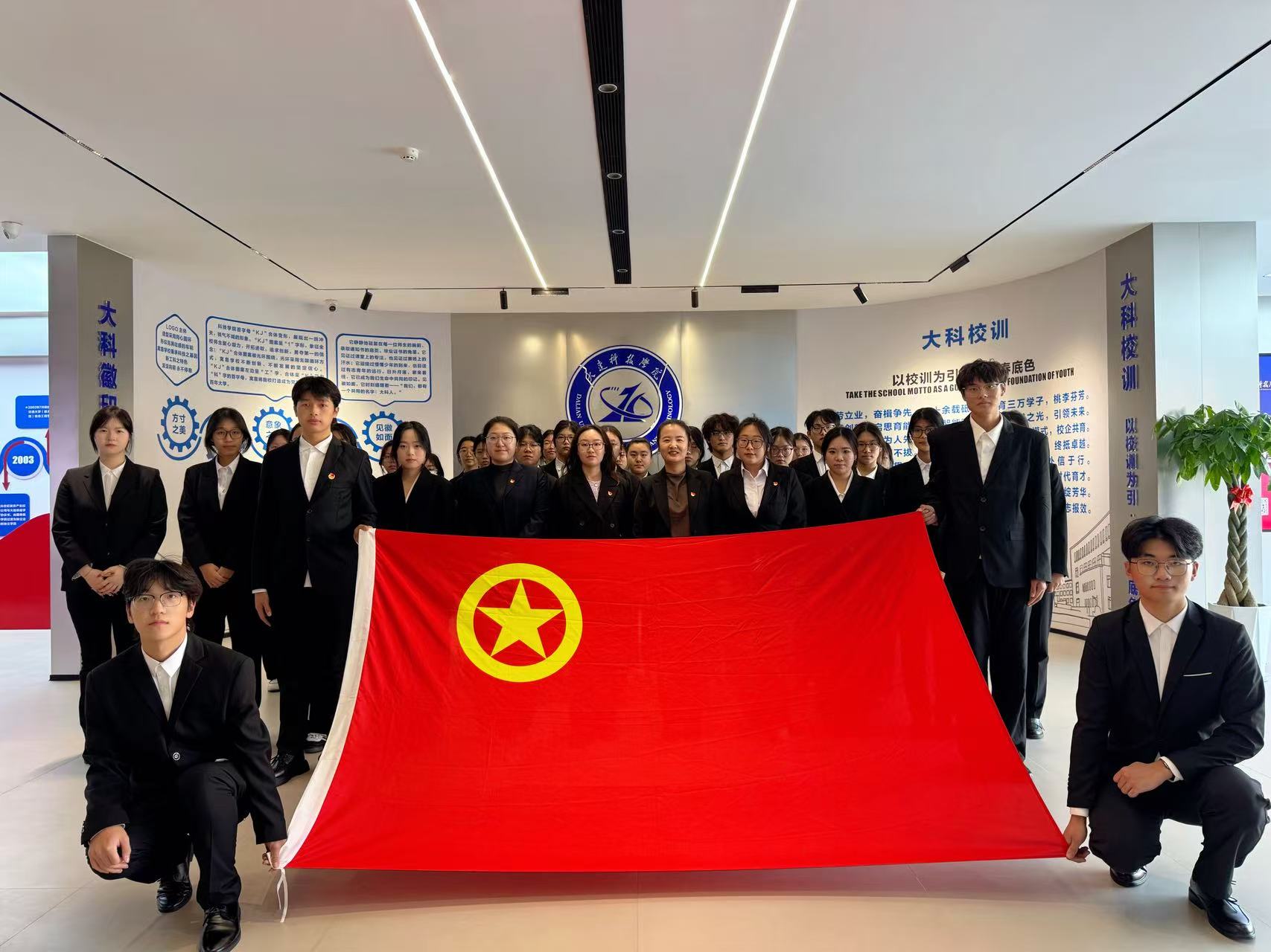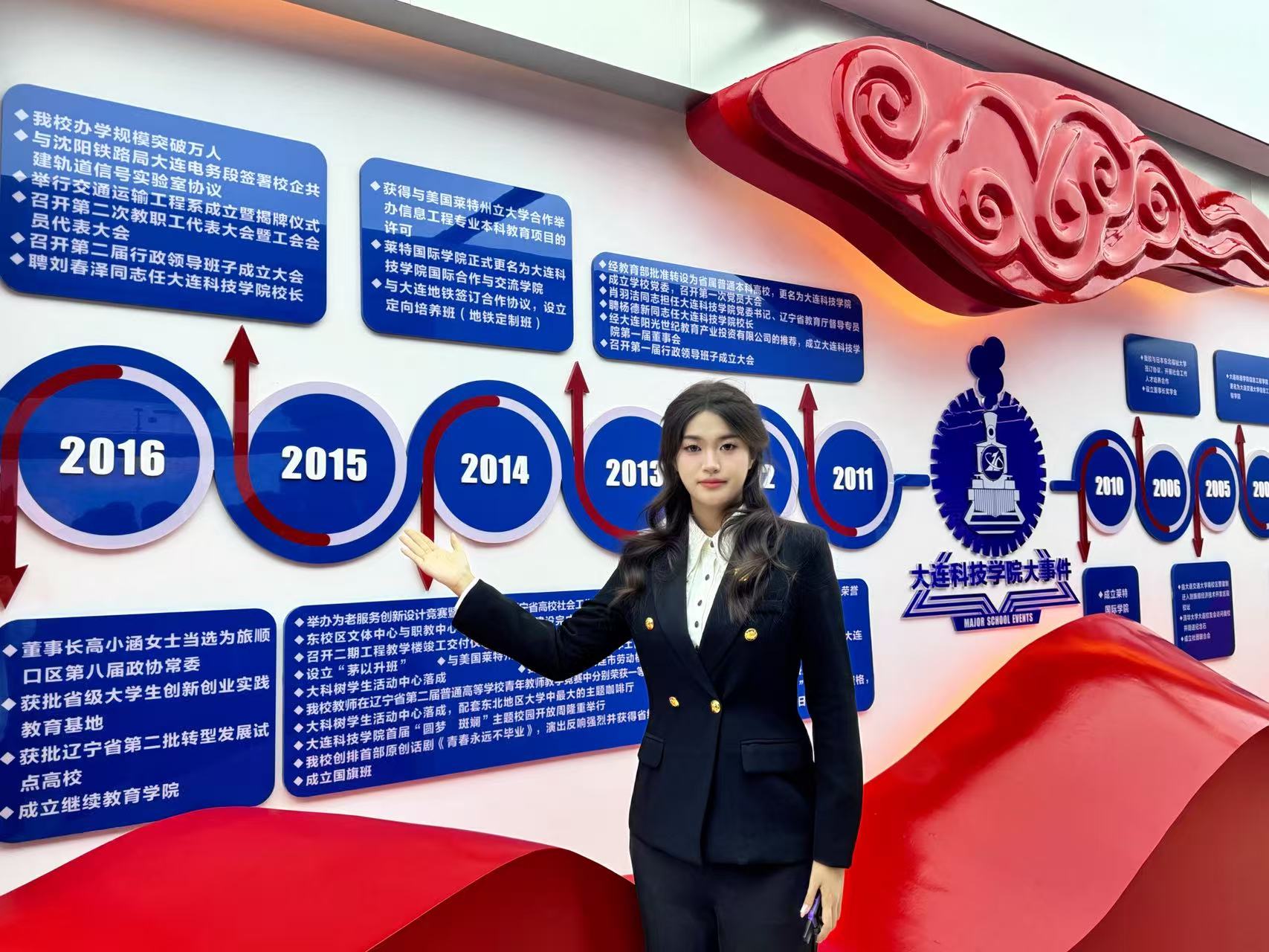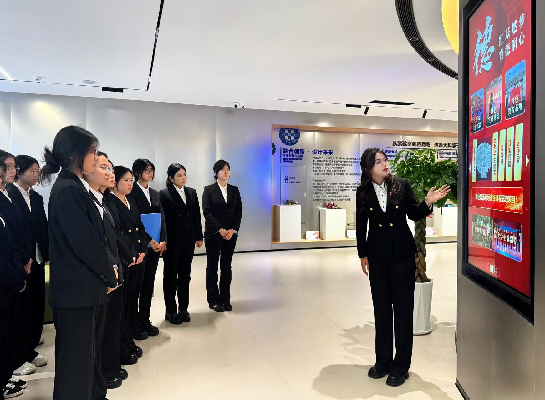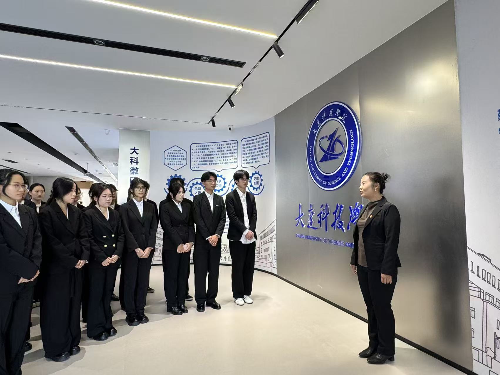 活动伊始,讲解员崔雪梅老师带领同学们走进育人品牌区“解码大科基因”,我校思政育人的“科创砺能,启智笃行”育人品牌在此鲜活亮相。崔老师以“三大工程”为主线,引导青年挺膺担当、助力成长成才。她更以校徽为引,深入阐释大连科技学院的校训——勤劳、智慧、勇敢、意志、信誉、责任、包容、感恩:勤劳是脚踏实地的奋进底色,智慧是攻坚克难的破局密钥,勇敢是挺膺担当的前行底气,意志是持之以恒的坚守力量,信誉是立身行事的根本准则,责任是勇担使命的价值追求,包容是兼容并蓄的胸怀格局,感恩是知恩向善的初心本色,字字铿锵间,尽显校训的厚重底蕴与育人温度。