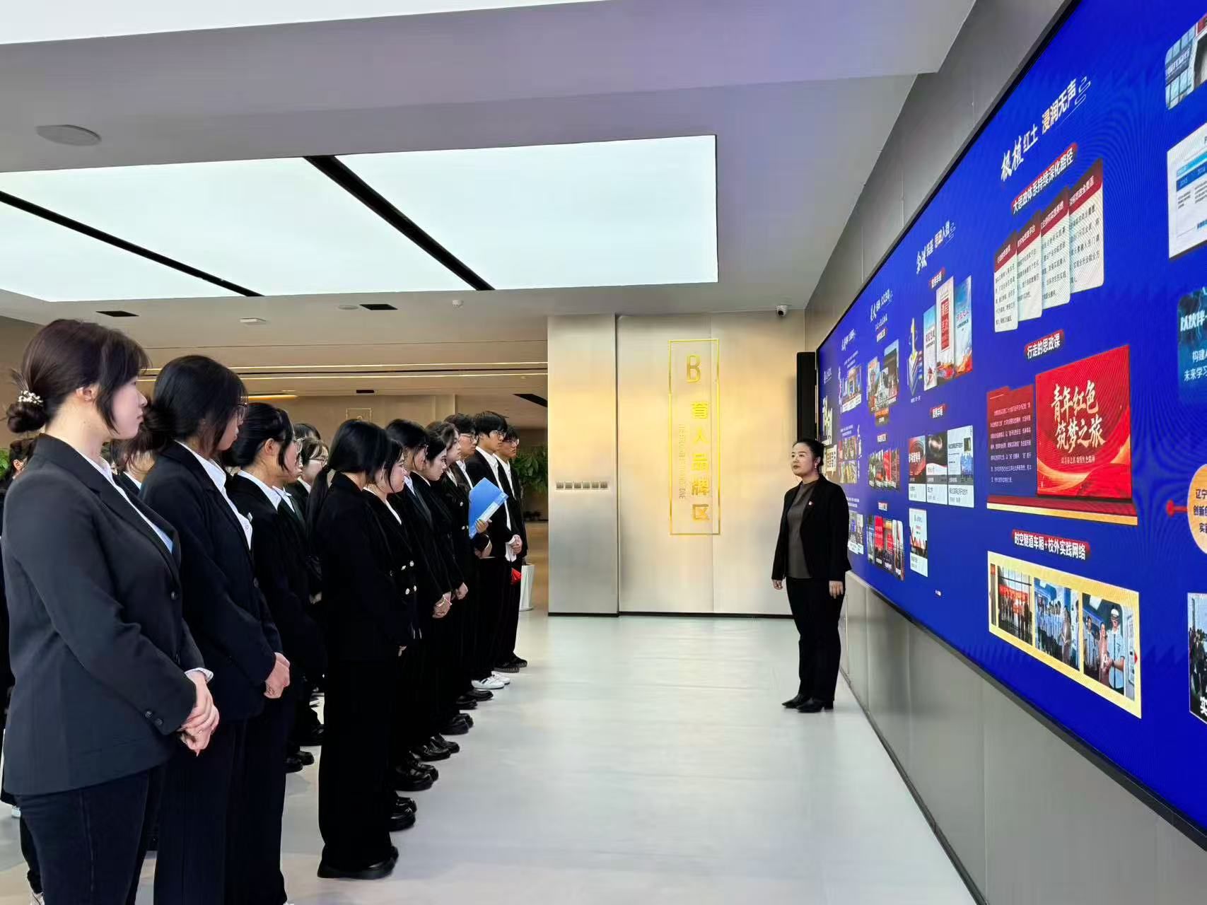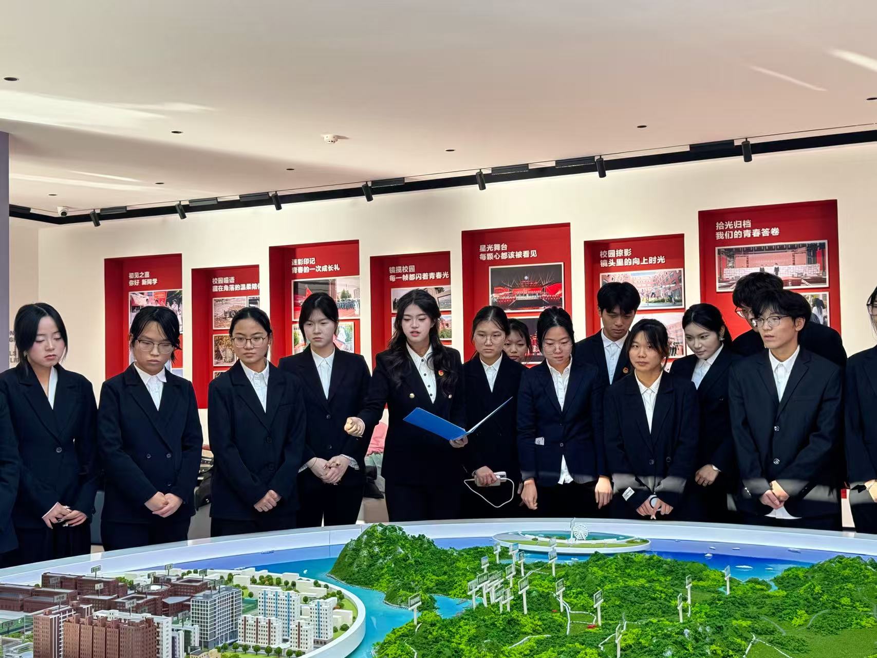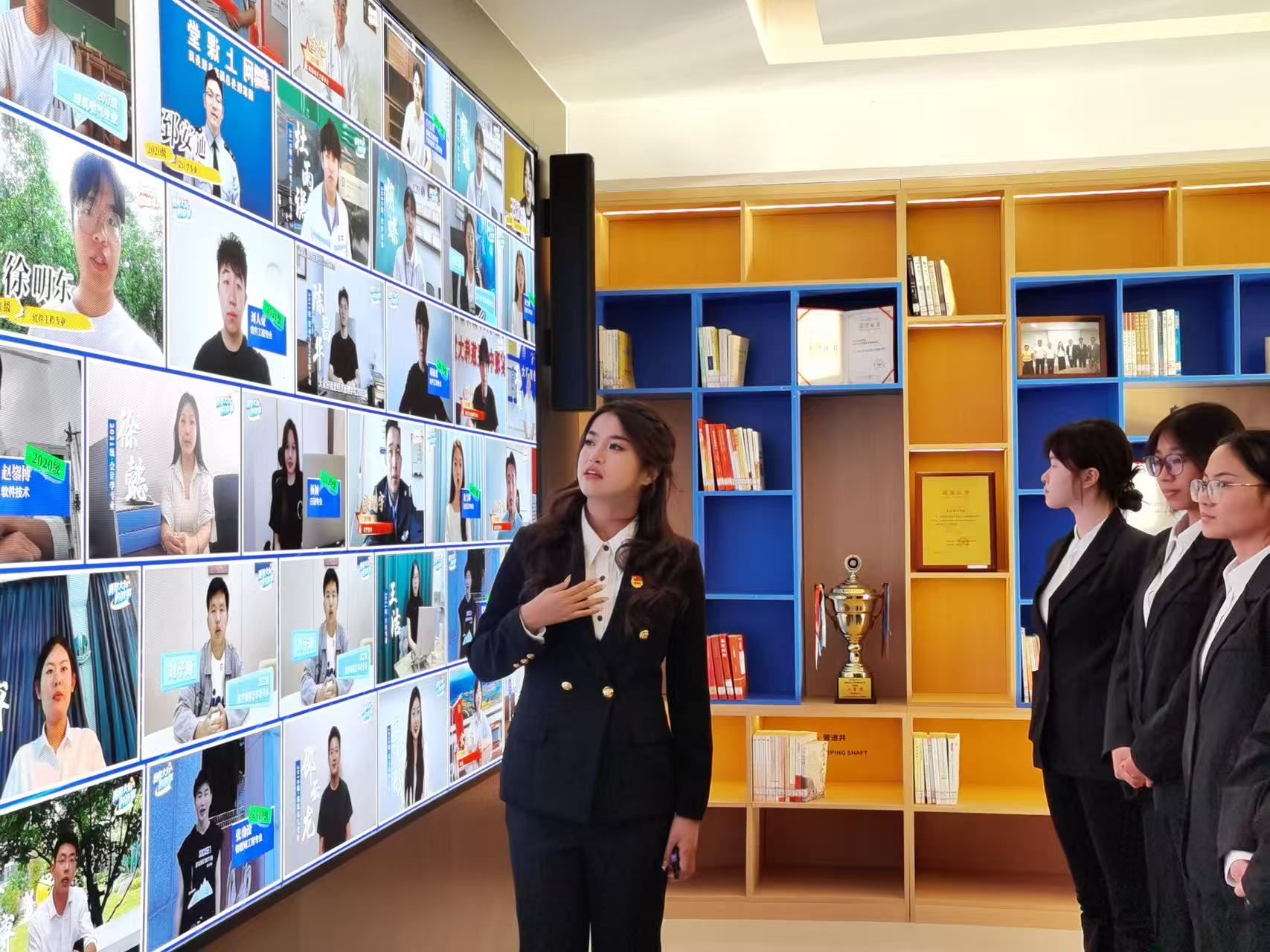 随后,讲解员外国语学院学生会组织部部长付柯萌同学带领大家有序参观五育成效区:看见成长轨迹。通过五块高清竖屏为载体,通过数据可视化的方式,集中展示“五育融合”成果。“大连科技学院大事件展区”以墙面时间轴为核心,通过凝练文字串联校史发展脉络,清晰呈现学校办学历程中的关键节点与重要成就;“数智沙盘”采用动态亮灯交互技术,指尖轻触即可清晰呈现校区建筑分布、功能分区及校外实践基地的地理布局,直观展现办学规模与实践资源;“我心中的思政课”展区既是师生思政认知的“发声站”,更是“三大工程”朋辈教育的鲜活展播平台。在这里,同学们仔细聆听毕业生分享与大科精神相伴的成长历程,那些扎根实践的坚守、薪火相传的初心,让这份精神在真实故事中愈发鲜活可感,也让思政教育的温度直抵人心。