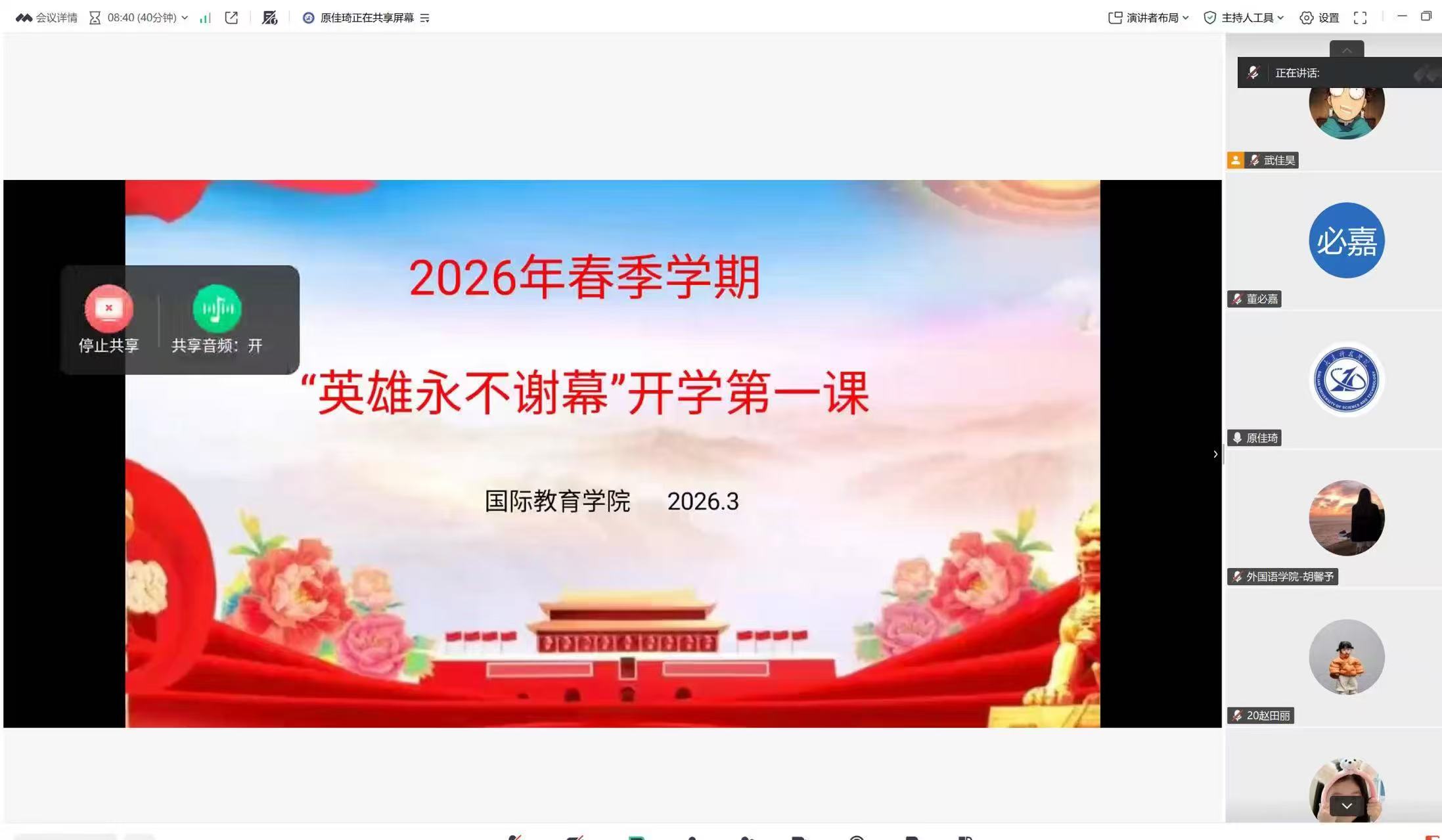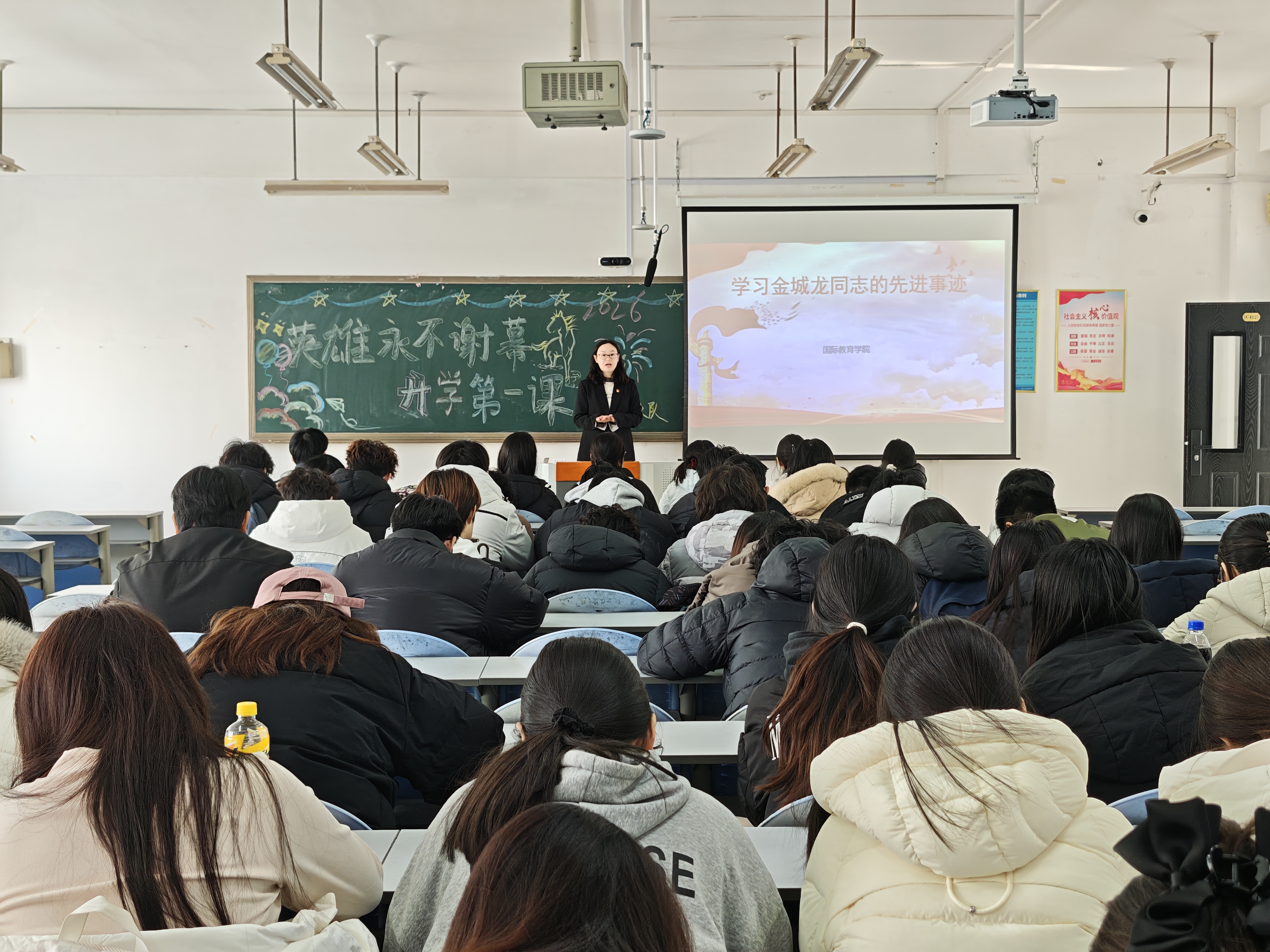 春风启新程,奋进正当时。本次“开学第一课”既是新学期的思想动员课,也是红色精神的传承课,更是青年成长的领航课。下一步,国际教育学院将持续深化红色育人实践,把金成龙同志的英雄精神全方位、全过程融入人才培养体系,引领广大学子以英雄为标杆,脚踏实地、笃行实干,将爱国情、强国志、报国行融入新时代征程。