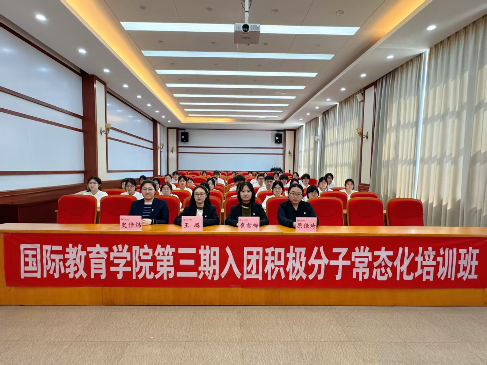 为进一步加强入团积极分子的培养教育工作,夯实青年学生思想根基,引导广大青年坚定理想信念、积极向团组织靠拢,2026年3月17日,国际教育学院第三期入团积极分子常态化培训班开班仪式在职教105教室顺利举行。国际教育学院党总支副书记兼副院长王璐老师、团委书记崔雪梅老师、辅导员史佳炜老师、原佳琦老师,以及第三期入团积极分子常态化培训班全体成员共同参与本次仪式,仪式由国际教育学院团委学生会文艺部部长娄佳怡主持。