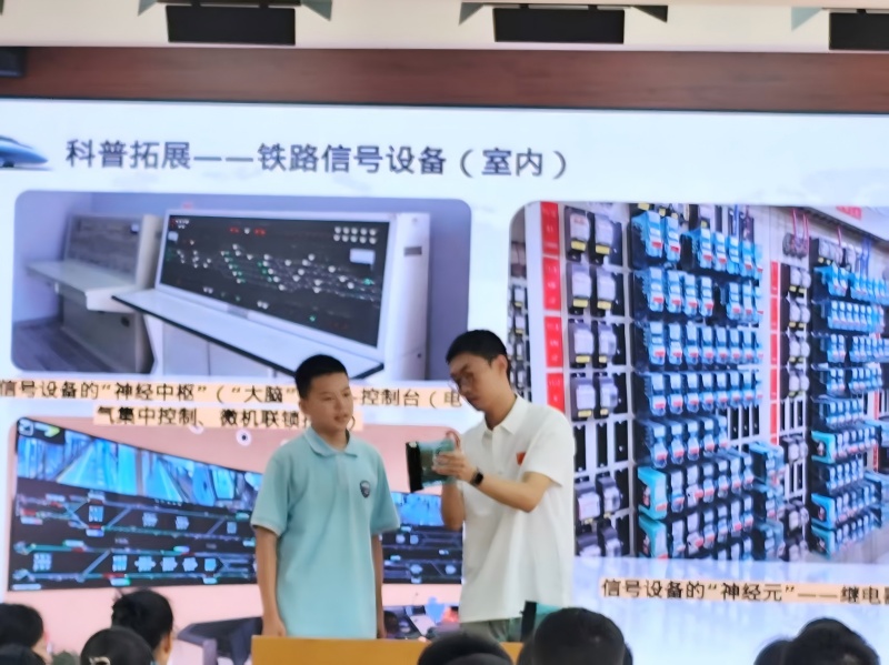 肖丰楠老师以“铁路列车如何安全进入站台停车”为主题,揭秘了铁路列车为何能精准对标停车,讲述了铁路信号设备原理,并通过讲解铁路信号系统中被广泛使用的继电器,结合现场操作带来沉浸式的交互体验,展现铁路信号通信技术,向青少年普及高速铁路信号系统知识,激发学生探索科学的兴趣。